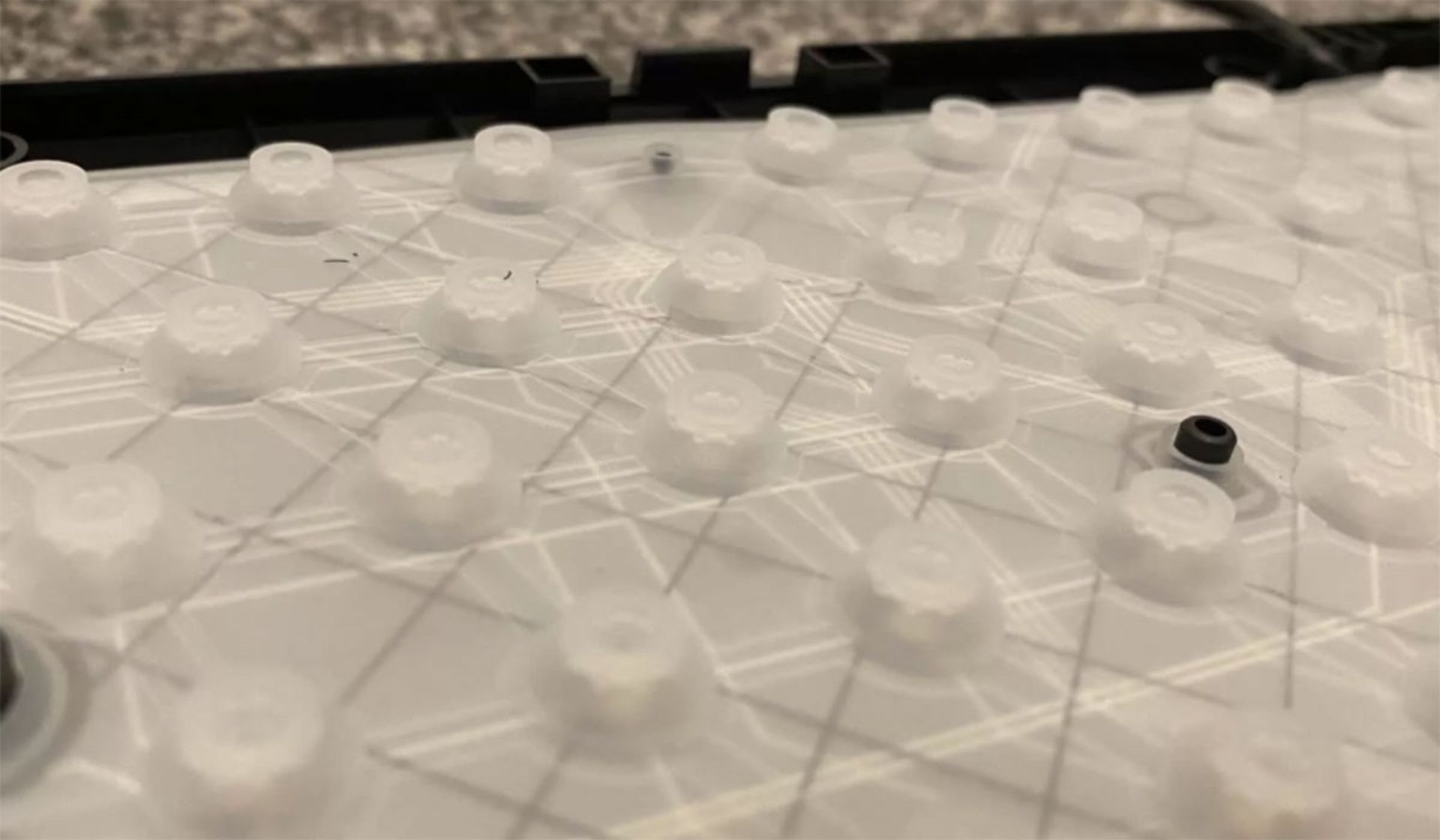 اگر طرحهای دنبالهدار موجود در غشا را تا صفحه مدار کوچک دنبال کنیم، میتوانیم در مجموع ۲۶ مورد از آنها را پیدا کنیم. آنها به گونهای مرتب شدهاند که چندین نقطه در امتداد یک ردیف قرار بگیرند. این شیوه طراحی بیش از حد پیچیده به نظر میرسد؛ اما در واقع سادهتر از داشتن ردیابهای اختصاصی و تکی برای هر کلید است. در این مدل، اتصالات بهطور دائمی به صفحه مدار متصل نیستند و این امر به کاهش هزینهها کمک میکند؛ بنابراین باید قطعات کاملا محکم در جای خود قرار بگیرند تا از اتصال مناسب اطمینان حاصل شود.