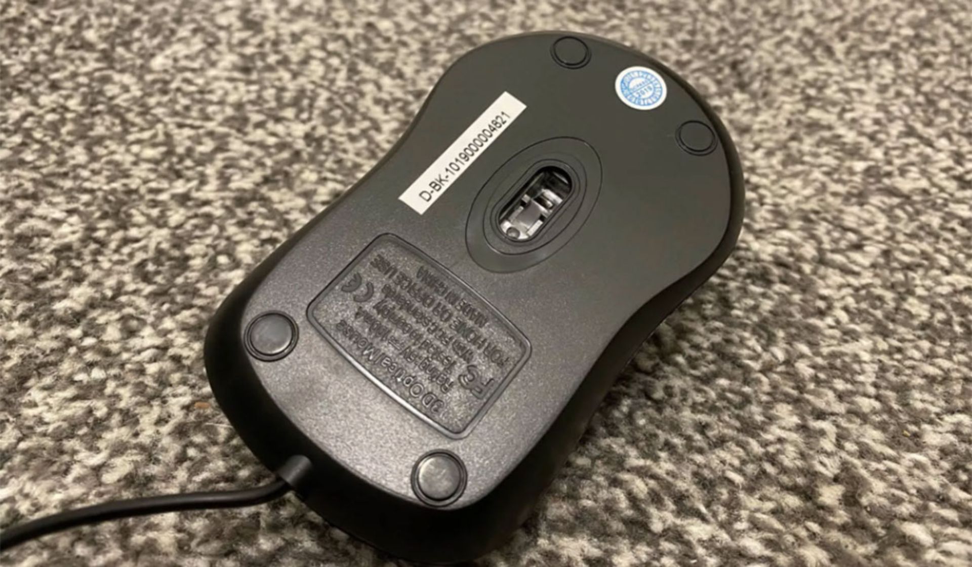 اگر ماوس را برگردانیم، سیستم حرکتی آن دیده میشود. زمانی که این گجت را باز میکنیم نگاه دقیقتری به قطعات مختلف این بخش خواهیم داشت. برای آسانتر شدن لغزش ماوس روی سطوح، بسیاری از آنها دارای پد پلیمر با اصطکاک کم (PTFE) هستند. البته نمونهی بسیار ارزانقیمتی که برای این مقاله انتخاب شدهاند، به جای این متریال از دیسک پلی پروپیلن صاف استفاده میکند.