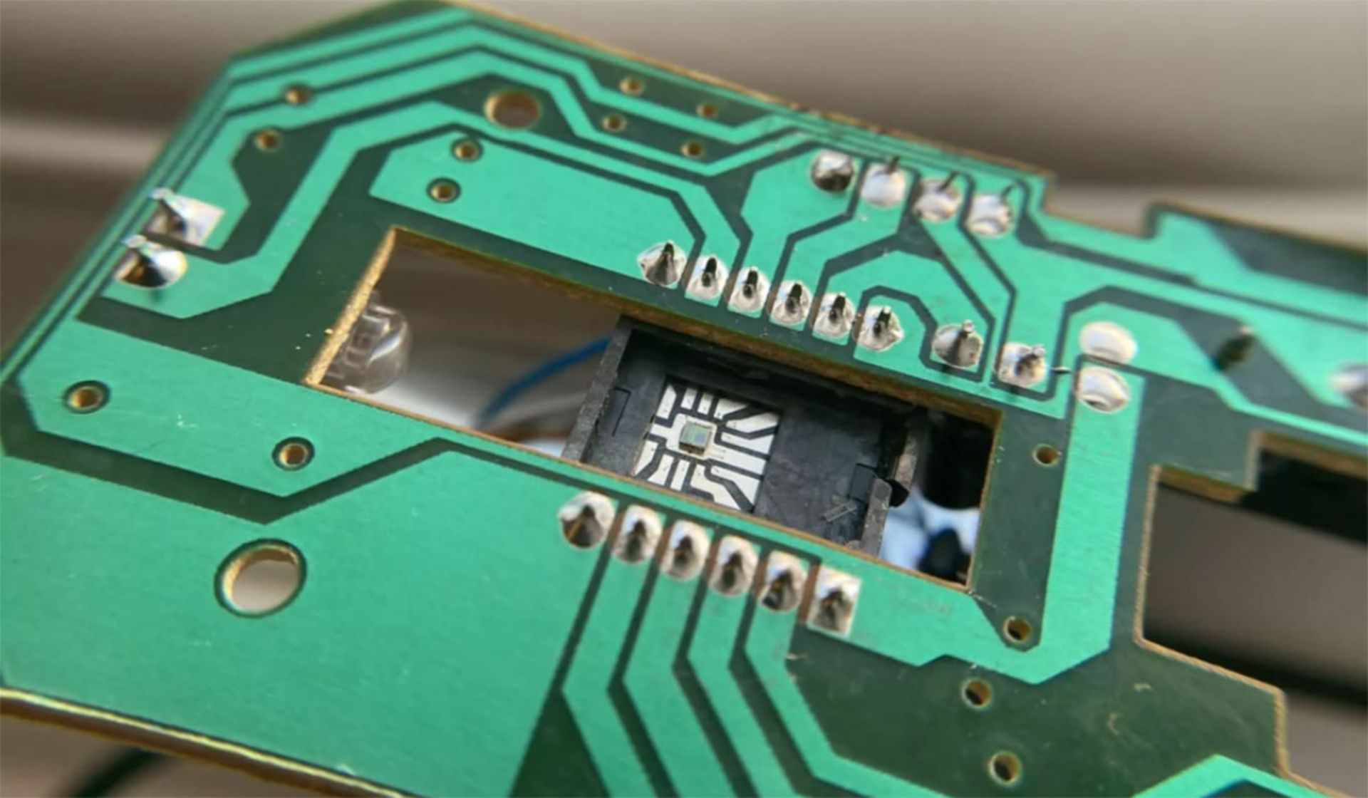 تراشه سیلیکون را میتوانید در تصویر بالا به همراه سیمهای ریز اتصالدهنده آن به بقیه مدارها مشاهده کنید. پچ کوچک آبی حسگر نور است. نیازی نیست این قطعه بسیار بزرگ یا میلیونها پیکسل داشته باشد، تنها اندازهای کافی است که بتوان از آن برای تشخیص سطح ماوس استفاده کرد.
