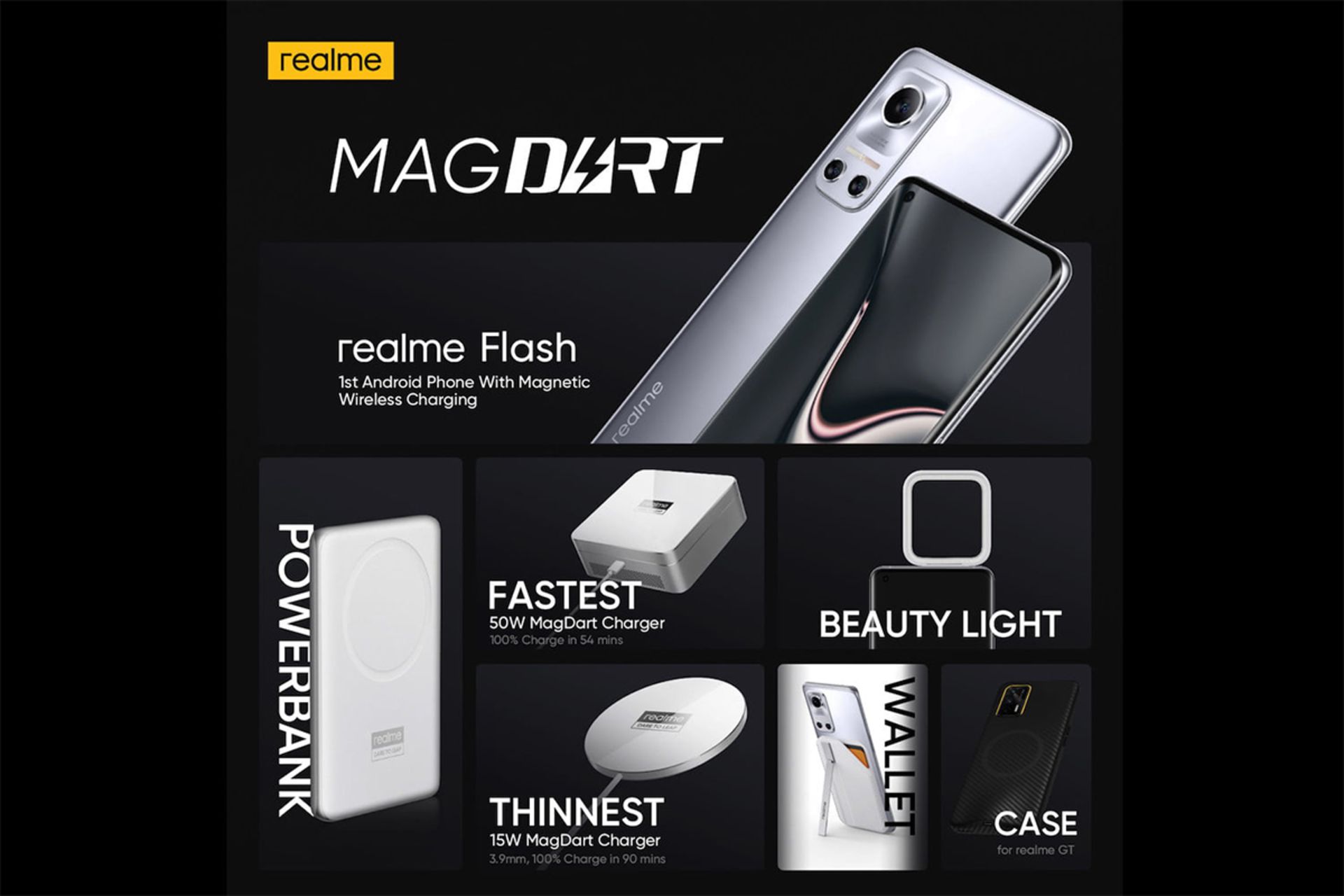 شارژر حجیم مگدارت ریلمی، یک آداپتور ۵۰ واتی است که سریعترین شارژر بیسیم مغناطیسی دنیا برای گوشیهای هوشمند به شمار میآید. برای مثال، باتری ۴۵۰۰ میلیآمپر ساعتی ریلمی GT (یا گوشی مفهومی فلش) با مگدارت، در کمتر از یک ساعت بهصورت کامل شارژ میشود که معادل شارژ با شارژر باسیم ۵۰ واتی سوپردارت همین شرکت است. یک فن داخلی هم برای مگدارت تعبیه شده است که در طول شارژ، گوشی و شارژر را خنک نگاه میدارد.