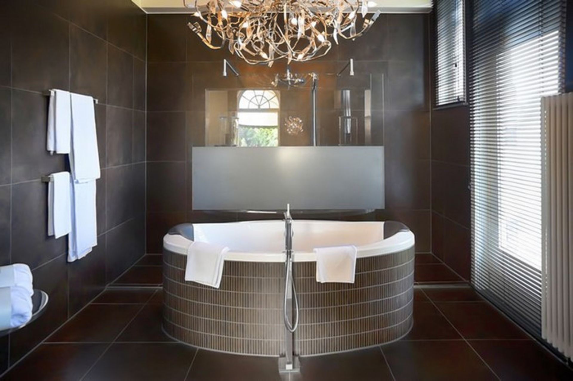 این حمام بزرگ با استفاده از مواد طبیعی و مصنوعی ترکیبی جذاب از رنگ و بافتهای مختلف را تشکیل میدهد. کف قسمت اصلی از سرامیکهای قهوهای تیره پوشیده شده است. در کف قسمت دوش از کاشیهای سنگریزه طبیعی استفاده شده است. دیوارهای این قسمت از موزاییکهایی چند رنگ طوسی و سرامیکهای بژ تشکیل شده است. باقی حمام با رنگ روشن بژ رنگ شده و کمدها هم از رنگ قهوهای تیره و متناسب با کف ساخته شدهاند.