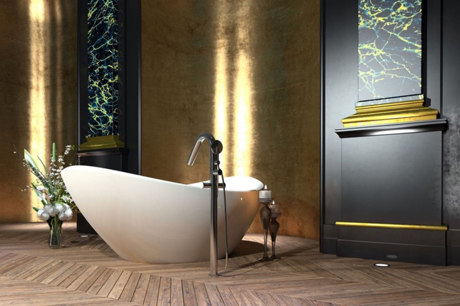 این حمام مدرن عاری از هرگونه دکوراسیون بیش از حد است اما در عوض دیواری بسیار چشمنواز در پشت وان ساده آن قرار دارد. در این دیوار از طرحهایی به رنگ بژ استفاده شدهاست. دیوارها، کف و بقیه حمام پوشیده از سرامیک کرم روشن هستند. کابینتها از ورقههایی به رنگ برنزی ساده و و با کانتری به رنگ قهوهای موکا پوشیده شدهاند.