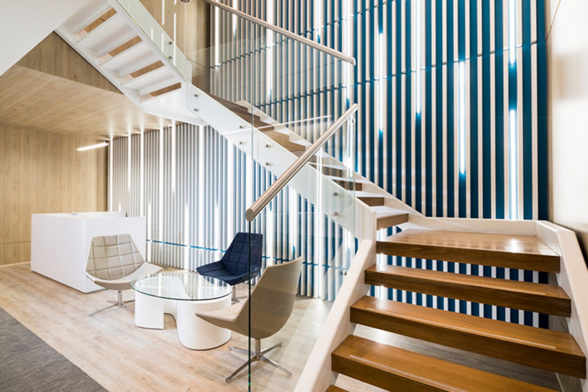 در سرتاسر فضای داخلی این دفتر کار از کفپوشهای چوبی، نورپردازی غیر مستقیم و ترکیبی از رنگ سفید و آبی استفاده شده است. در واقع طراحی داخلی و دکوراسیون این دفتر کار، هویت و برند تجاری شرکت را برجستهتر میکند. برای طراحی قسمتهایی از دفتر مانند اتاق جلسات که کارکنان به سکوت و تمرکز بیشتری نیاز دارند، از دیوارههای شیشهای استفاده شده است؛ بدین ترتیب بخشهایی از دفتر کار با استفاده از دیوارهای شیشهای از سایر قسمتها جدا میشود.