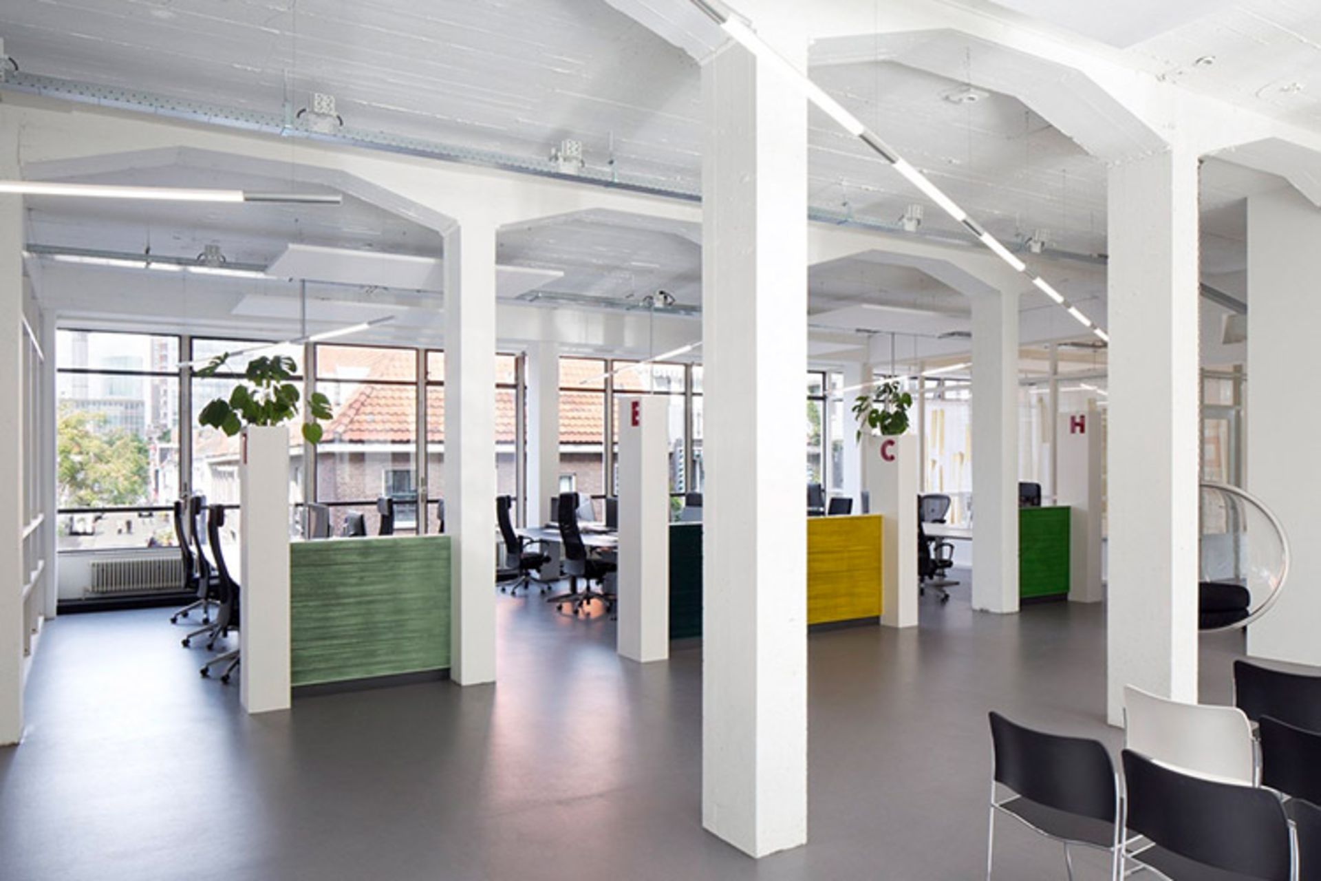 اما بخشی از این دفتر کار برای فعالیتهای گروهی کارمندان و بهصورت open plan طراحی شده است. در این قسمت از پنلهای آکوستیک برای کاهش سروصدای محیط کار استفاده شده است. این پنلهای جاذب صدا رنگهای شاد و متنوع دارند که باعث شدهاند دفتر کار طراحی زیباتری داشته باشد. برای فعالیتهایی که به سکوت و تمرکز بیشتری نیاز دارند، اتاقهای شخصی طراحی شده است.