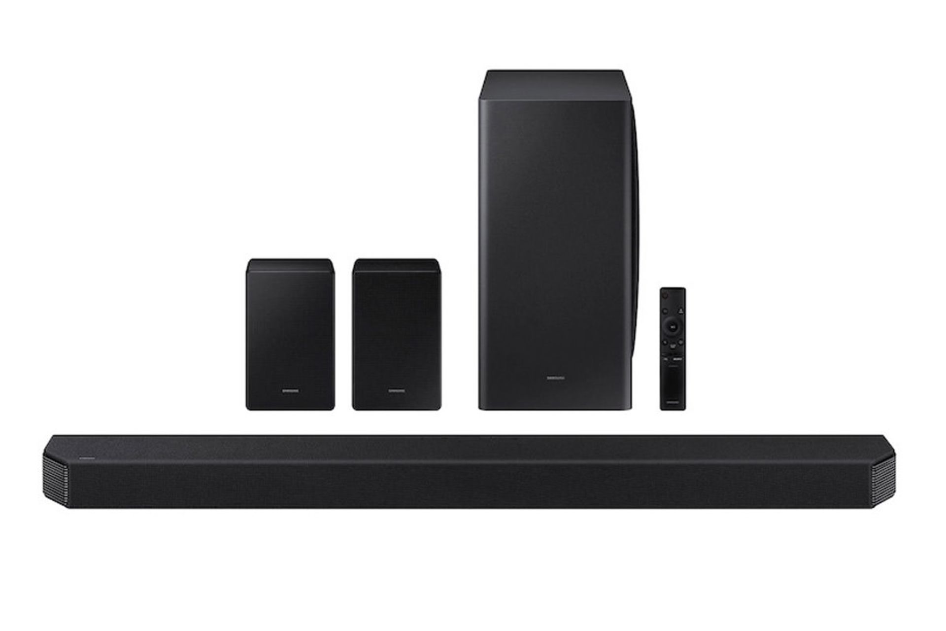 ساندبار HW-Q950A سامسونگ دارای صدای 11.1.4 کاناله است و با سابووفر بیسیم و اسپیکرهای بیسیم عقب همراه است. این محصول دارای هفت درایور (دو عدد در کنار، دو عدد در بالا و سه عدد در جلو) و اسپیکرهای عقب هرکدام دارای دو درایو (یکی در جلو و یکی در بالا) است و برای ارائهی تجربهی لذتبخش و گوشنواز، با دالبی اتموس و DTS:X سازگاری دارد.