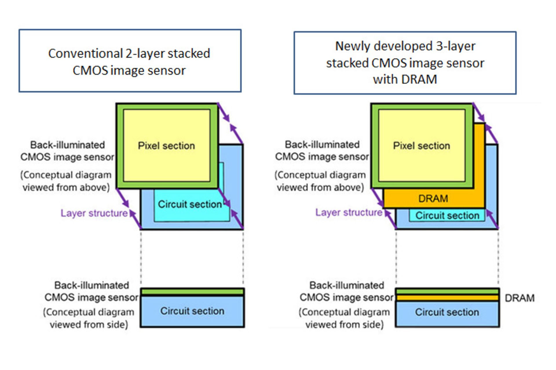 سونی سنسور سه لایهی CMOS را برای اولین بار بهمنظور استفاده در گوشیهای هوشمند رونمایی کرد. این سنسور سه لایه به حافظهی DRAM نیز مجهز شده است. سنسورهای پیشین سونی ساختاری دو لایه دارند که از جملهی آنها میتوان به IMX318 اشاره کرد. این سنسور CMOS سه لایه، سایزی ۱/۲.۳ اینچی دارد و رزولوشن آن نیز ۲۱.۲ مگاپیکسل است که از وجود یک لایهی اضافه بهعنوان حافظهی DRAM بهره میبرد. حافظهی DRAM که بهعنوان لایهی جدید به سنسور اضافه شده، در بین دو لایهی ثبت تصویر و همچنین پردازش منطقی قرار گرفته است.
