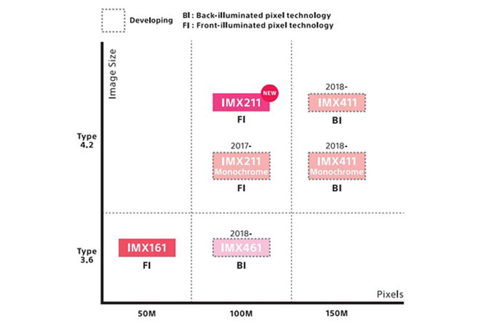 بر اساس اطلاعات ارائهشده، سونی در نظر دارد در سال ۲۰۱۸ دو سنسور ۱۰۰ مگاپیکسلی ۴۴ در ۳۳ میلیمتری و یک سنسور ۱۵۰ مگاپیکسلی ۵۵ در ۴۱ میلیمتری مدیوم فرمت معرفی کند. هر دو سنسور سونی از نوع BSI یا Backside Illuminated هستند که با استفاده از آن میتوان در محیطهای کمنور خروجی بسیار درخوری از نظر کیفیت بالای تصویر دریافت کرد. سنسور ۱۵۰ مگاپیکسلی از نوع سنسوری است که اکنون در دوربینهایی نظیر GFX فوجی و X1D هسلبلاد مورد استفاده قرار میگیرد. احتمالا سنسور ۱۵۰ مگاپیکسلی سونی در دوربین Phase One 100XF مورد استفاده قرار خواهد گرفت. همچنین در نقشهی راه سونی میتوان برنامهریزی برای رونمایی از یک سنسور مونوکروم یا سیاه و سفید ۱۵۰ مگاپیکسلی ۵۵ در ۴۱ میلیمتری را نیز مشاهده کرد که در سال ۲۰۱۸ معرفی خواهد شد.
