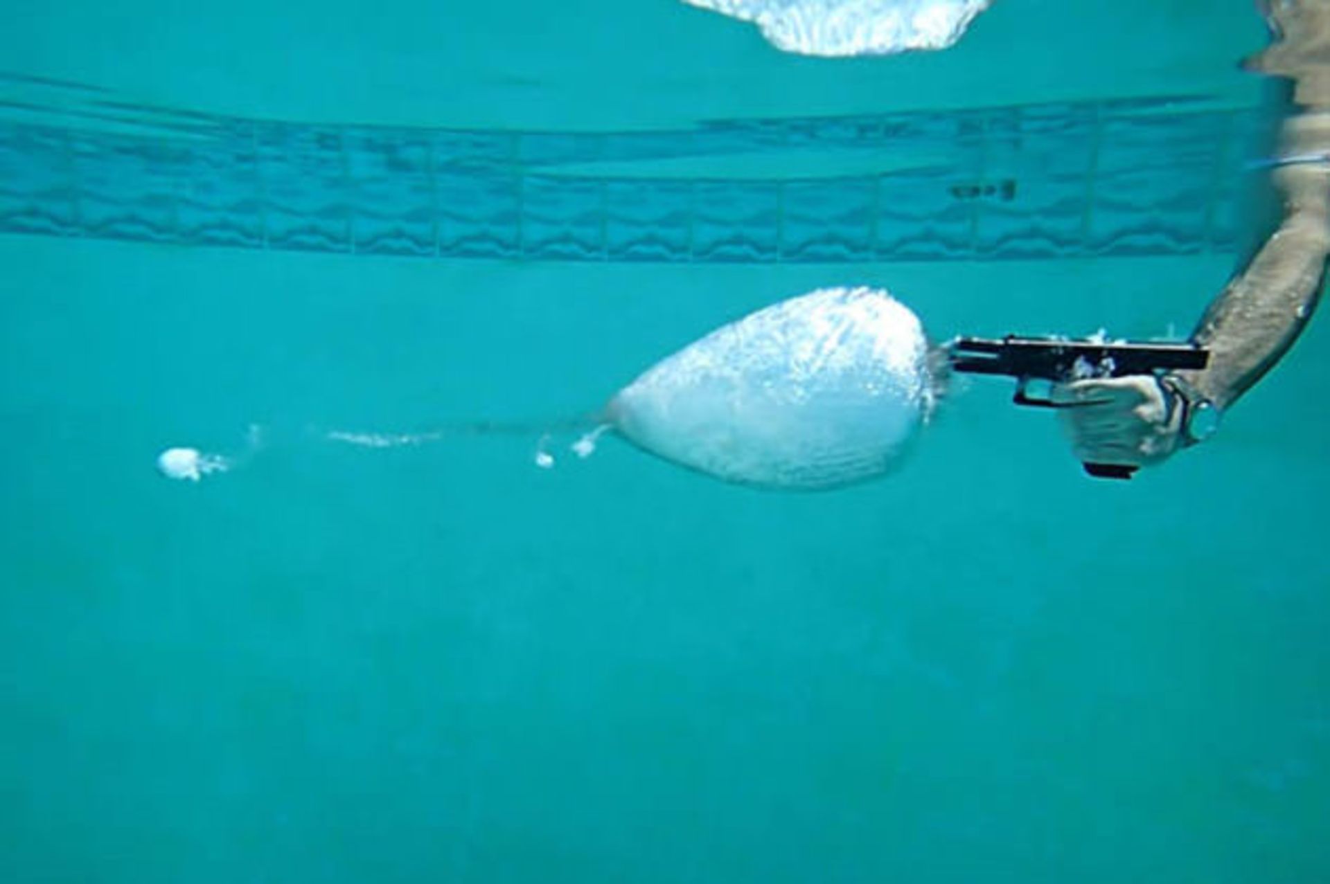 همانطور که در ویدیو مشاهده کنید گلوله پس از چند متر حرکت در آب متوقف میشود.
