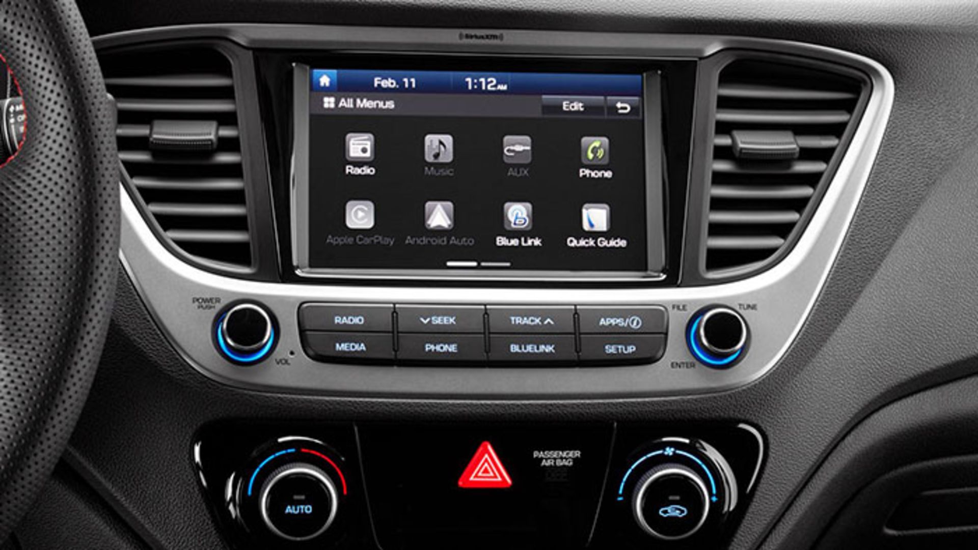 در داخل خودرو یک صفحهنمایش لمسی ۷ اینچی با قابلیت پشتیبانی از نرمافزارهای Apple CarPlay و Android Auto وجود دارد. امکان دادن فرمان صوتی، دو درگاه USB و جک ۳.۵ میلیمتری هدفون از ویژگیهای دیگر سیستم صوتی اکسنت ۲۰۱۸ هستند.