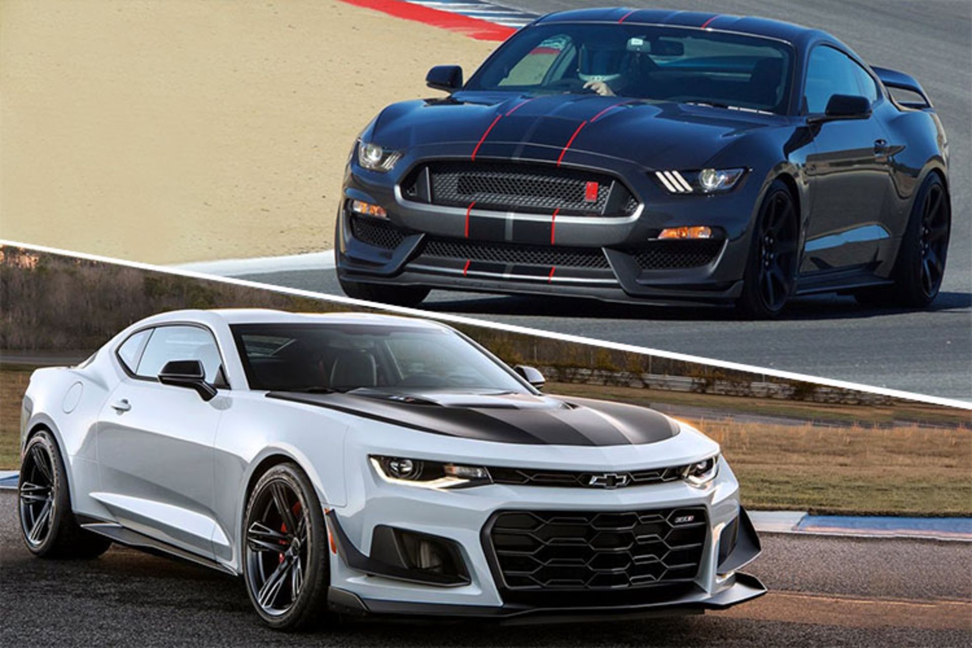 در آزمون سرعت در مسیر مستقیم، شلبی GT350R ظرف ۳.۹ ثانیه به سرعت ۱۰۰ کیلومتر بر ساعت میرسد، در ۸.۶ ثانیه به سرعت ۱۶۰ کیلومتر بر ساعت خواهد رسید و حدود ۲۱ ثانیه بعد از حرکت، سرعت ۲۴۰ کیلومتر بر ساعت به دست خواهد آورد. کامارو ZL1 برای رسیدن به سرعت ۱۰۰ کیلومتر بر ساعت به ۳.۴ ثانیه زمان احتیاج دارد، ظرف ۷.۴ ثانیه به سرعت ۱۶۰ کیلومتر بر ساعت میرسد و ۱۸.۵ ثانیه طول میکشد تا از حالت سکون به سرعت ۲۴۰ کیلومتر بر ساعت برسد. نهایت سرعت موستانگ شلبی GT350R، حدود ۲۸۰ کیلومتر بر ساعت و بیشینهی سرعت کامارو ZL1، نزدیک به ۳۱۵ کیلومتر بر ساعت است.