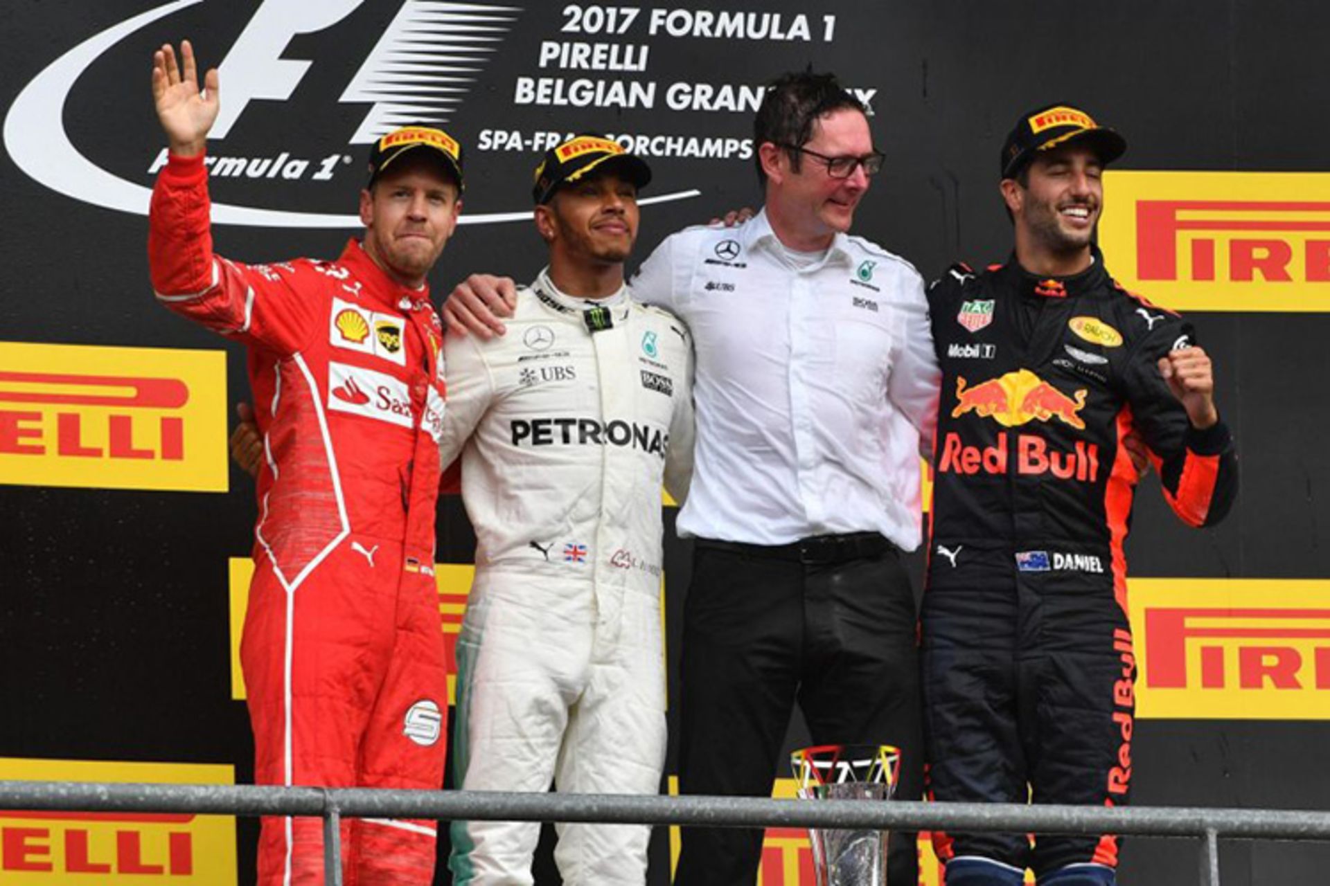 هرچند سباستین فتل از تیم فراری، تلاش زیادی از خود نشان داد و حتی سریعترین زمان یک دور را با یک دقیقه و ۴۶.۵۵۵ ثانیه ثبت کرد، نتوانست اقتدار همیلتون در پیست بلژیک را تغییر دهد و روی سکوی دوم ایستاد. دنیل ریکیاردو، در ادامهی عملکرد خوب خود در مسابقات قبلی، رتبهی ارزشمند سوم را به دست آورد تا یک بار دیگر، میان بزرگان فرمول یک قرار گیرد.