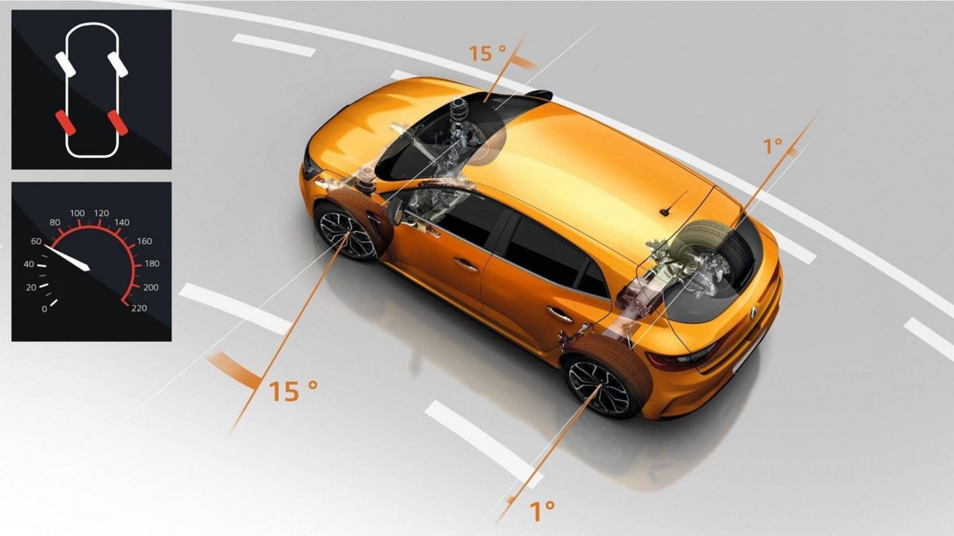 از بارزترین مشخصات رنو مگان RS ۲۰۱۸ میتوان به کمکفنرهای هیدرولیک این خودرو اشاره کرد که در هر دو محور جلو و عقب از آنها استفاده شده است. فشار داخلی این کمکفنرها میتواند بسته به نوع رانندگی تغییر کند. ضمن اینکه زاویهی چرخهای عقبی میتواند توسط سیستم 4 Control تغییر کند و به این ترتیب چسبندگی و پایداری خودرو در تمامی شرایط در بهترین حالت قرار دارد. سیستم 4 Control در خودرو مگان GT بهصورت استاندارد عرضه میشود و بسته به سرعت اتومبیل، کارکرد آن میتواند تغییر کند؛ بهطوری که تا سرعت ۶۰ کیلومتر بر ساعت چرخهای عقب در جهت خلاف چرخهای جلو فرمان میپذیرند؛ اما با گذر از سرعت ۶۰ کیلومتر بر ساعت، چرخهای عقب به شکل موازی با چرخهای جلو زاویه میگیرند و این شرایط تا سرعت ۲۵۰ کیلومتر بر ساعت ادامه دارد.