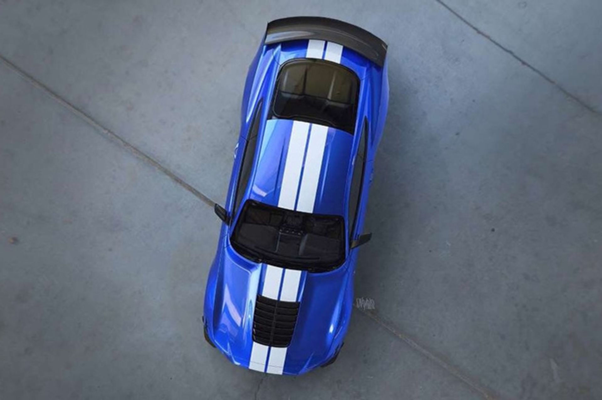تصویر رسمی، این خودرو را از نمای بالا نشان میدهد که با رنگ آبی مخصوص شلبی و نوارهای مسابقهای دوگانه سفید مزین شده است. این ویژگی در تمامی مدلهای پیشین تکرار شده بود، اما به نظر میرسد که خودروی اسپرت فورد موستانگ شلبی GT500 مدل ۲۰۲۰ کمی پیشرفتهتر از پیشینیان خود ظاهر شود.
