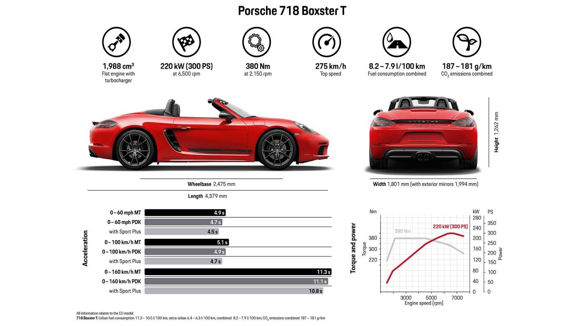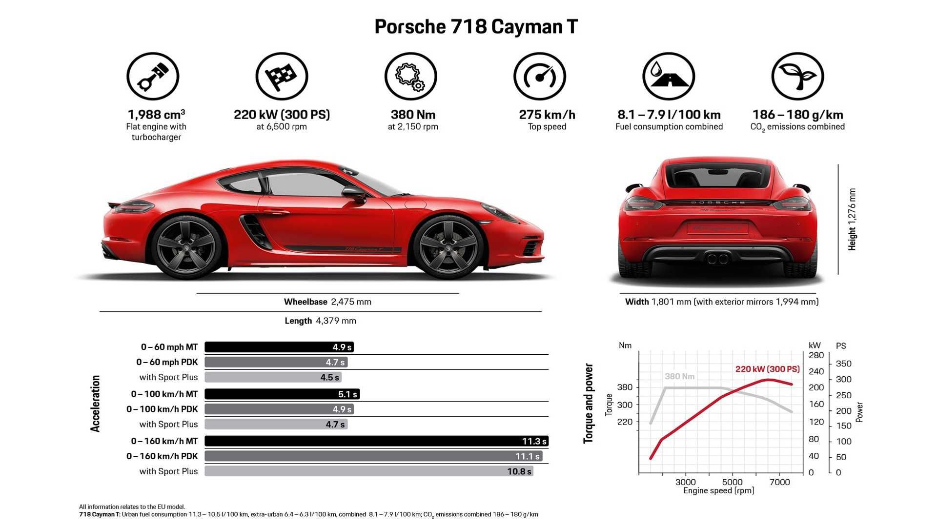 پیشرانه هر دو مدل پورشه باکستر (روباز) و کیمن (کوپه) را قادر میسازد تا سرعت ۰ تا ۹۶ کیلومتربرساعت را در زمان ۴.۹ ثانیه با جعبهدنده دستی طی کنند؛ درحالیکه با استفاده از جعبهدنده PDK این زمان ۰.۲ ثانیه سریعتر خواهد بود. در حالت اسپرت پلاس نیز پورشه 718T میتواند در زمان ۴.۵ ثانیه از حالت سکون به سرعت ۹۶ کیلومتربرساعت دست یابد و بیشینه سرعت آن به ۲۷۵ کیلومتربرساعت محدود میشود.