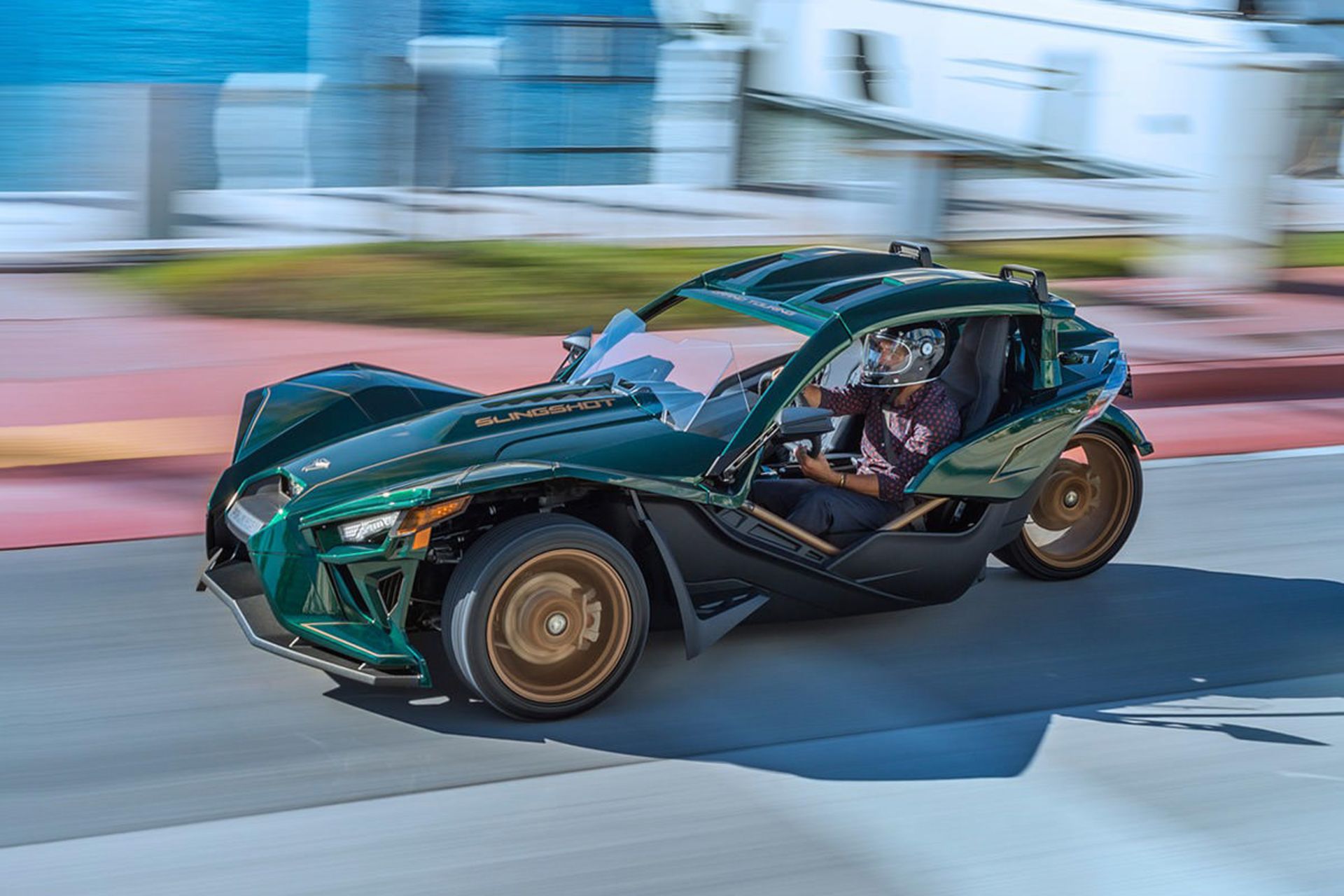 شرکت پولاریس (Polaris) خودرو سهچرخ جدید اسلینگشات گرند تورینگ الای (Slingshot Grand Touring LE) را رونمایی کرد. این نسخهی محدود که با هدف ارائهی «راحتی و مد و طراحی در سطح آینده» طراحی شده است، با نمای بیرونی Fairway Green و تزیینات برنز متضاد و رینگهای برنز مخصوص متمایز میشود.
