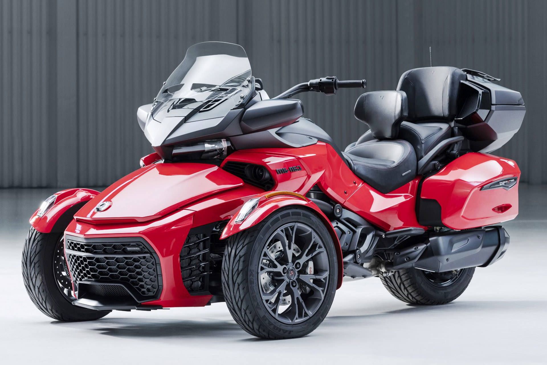 نمای سه چهارم خودرو سه چرخ کن ام اسپایدر / Can-Am Spyder قرمز رنگ