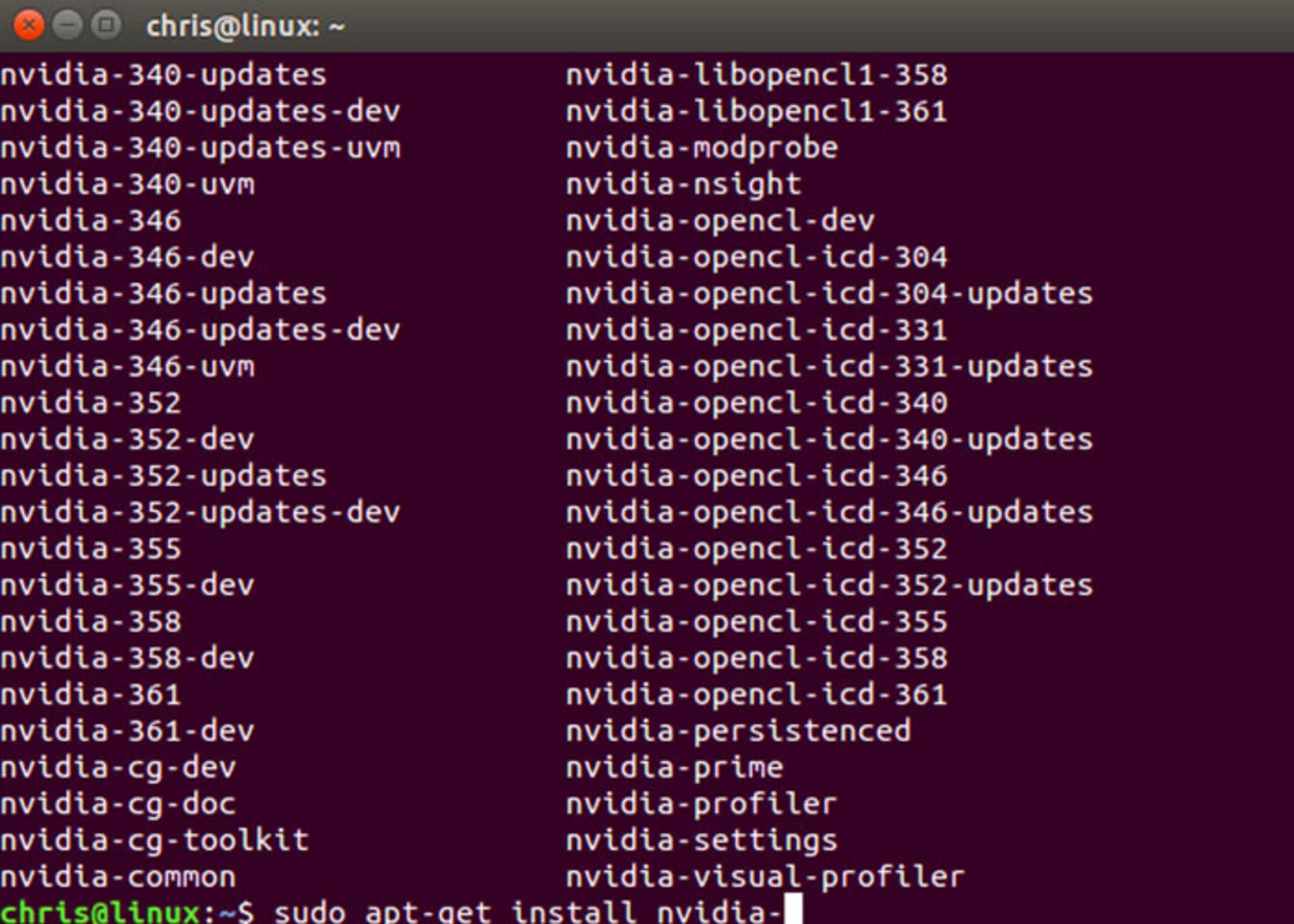 با انجام این کار، درایورهای گرافیکی قابل نصب و بروز شدهی انویدیا نمایان خواهند شد. میتوانید برای مشاهدهی بروزترین نسخههای در دسترس درایورها، به صفحهی توضیحات PPA مراجعه کرده یا فرمان “sudo apt-get install nvidia-” را در ترمینال تایپ کرده و کلید تب را از صفحه کلید بفشارید. به عنوان مثال، در هنگام نگارش این مقاله، نسخهی ۳۶۱ درایورهای گرافیکی انویدیا، بروزترین نسخهی موجود است که میتوانید برای نصب آن از دستور متنی “sudo apt-get install nvidia-361” استفاده کنید.