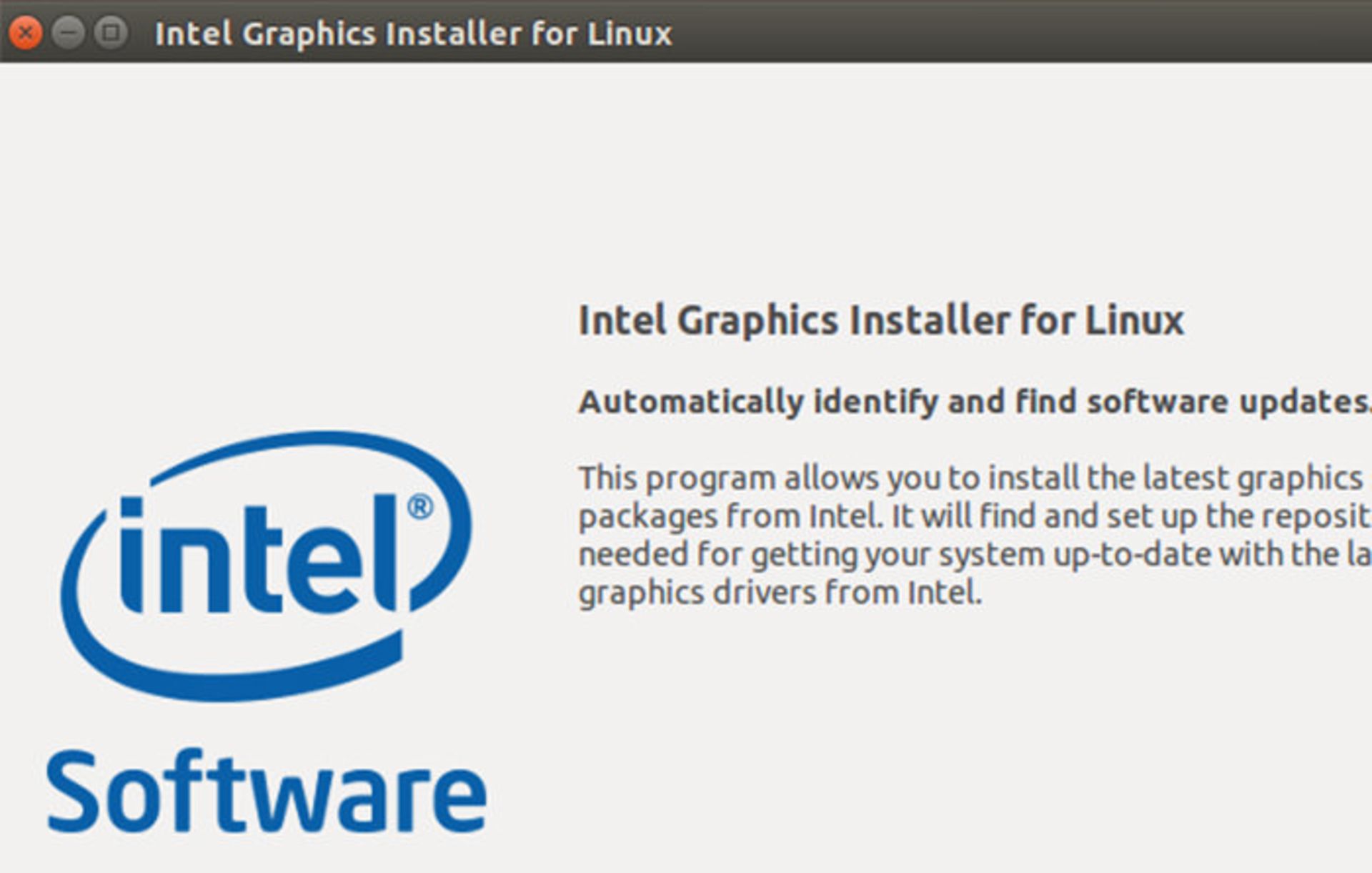 شرکت اینتل، نرمافزار نصب کنندهی درایورهای گرافیکی خود را برای سیستمعامل لینوکس توسعه داده است. این نرمافزار به طور خودکار، درایورهای گرافیکی منبع باز سازگار با اوبونتو را دانلود و نصب میکند. در زمان نگارش این مقاله، آخرین نسخهی نصب کنندهی درایور گرافیکی اینتل برای لینوکس نسخهی 1.2.1 بود که فقط از اوبونتوی نسخهی 15.10 پشتیبانی میکند. این احتمال وجود دارد که نرمافزار یاد شدهی اینتل، برای همیشه فقط از آخرین نسخهی اوبونتو پشتیبانی بکند و با بروز شدن اوبونتو، نسخههای قبلی از لیست پشتیبانی آن خارج شود. هیچ نسخهای از درایورهای کارت گرافیک اینتل در منبع PPA موجود نیست. اما خوشبختانه، نرمافزار یاد شده دارای رابط کاربری گرافیکی است که میتوانید پس از نصب آن، از طریق منوی نرمافزارهای سیستمعامل (applications menu)، ابزار Intel Graphics Installer را اجرا کنید. این ابزار به طور خودکار، بروزترین درایور کارت گرافیک را از سرورهای شرکت اینتل دانلود و نصب خواهد کرد.