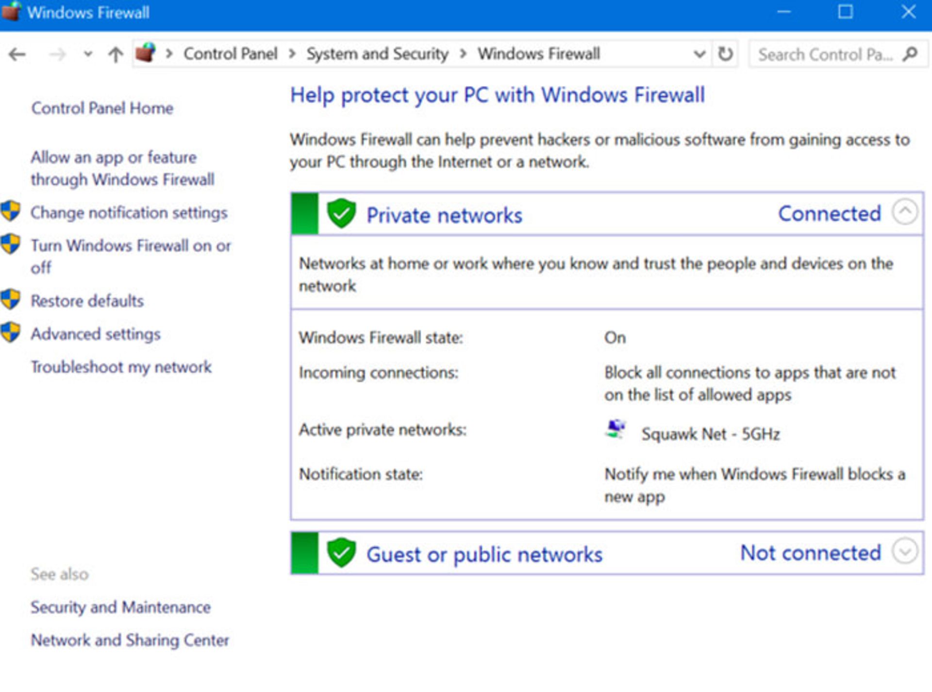 به علاوه، دیوار آتش (Firewall) ویندوز 10 هم دارای تنظیمات متفاوتی برای شبکههای عمومی و خصوصی است. به منظور پیکربندی تنظیمات فایروال داخلی، میتوانید در کنترل پنل روی System and Security کلیک کرده و سپس Windows Firewall را بزنید. برای مثال، میتوانید تنظیماتی را اعمال کنید که دیوار آتش در شبکهی خصوصی غیرفعال و در شبکهی عمومی فعال باشد؛ اما ما قطعا استفاده از چنین تنظیماتی را پیشنهاد نمیکنیم. همچنین میتوانید با کلیک روی Allow an app or feature through Windows Firewall، اقدام به ایجاد تغییر در قوانین دیوار آتش برای داشتن رفتاری متفاوت در شبکههای عمومی و خصوصی کنید.