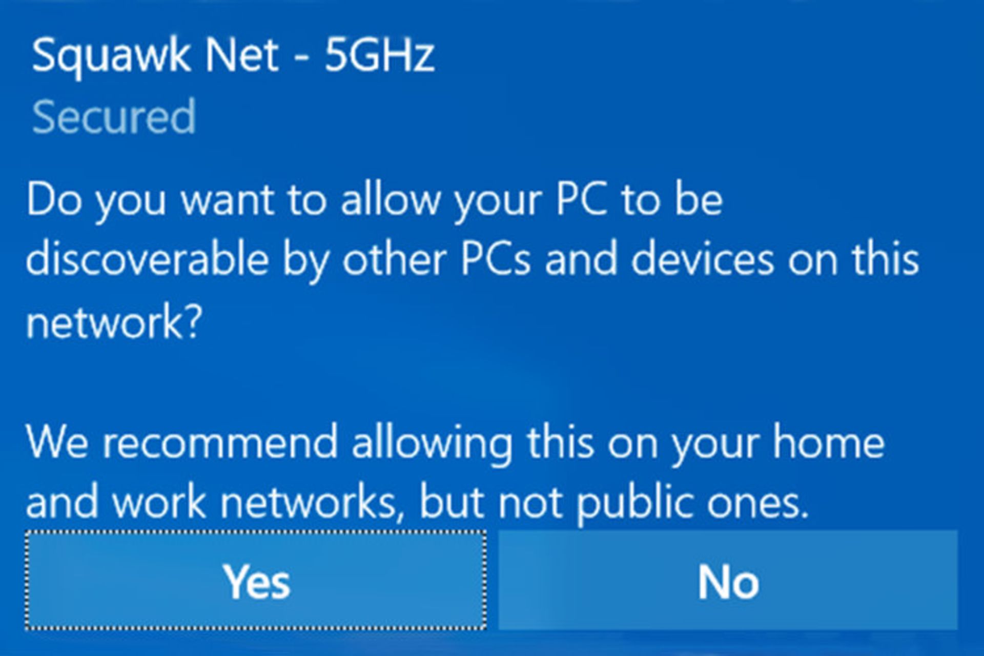 هنگامی که برای بار اول به شبکهای متصل میشوید، ویندوز 10 بلافاصله اجازهی یافت شدن رایانه در شبکه به وسیلهی رایانههای دیگر را از کاربر درخواست میکند. پاسخ کاربر به سوال یاد شده باعث میشود که ویندوز به نوع شبکهای که متصل هستید پی برده و تنظیمات صحیح مربوط به آن شبکه را اعمال کند. به عنوان مثال، سیستم عامل ویندوز 10 به طور چشمگیری در شبکههای عمومی، عملکرد محافظهکارانهای نسبت به شبکههای خانگی داشته و تدابیر امنیتی بیشتری را اعمال خواهد کرد.
