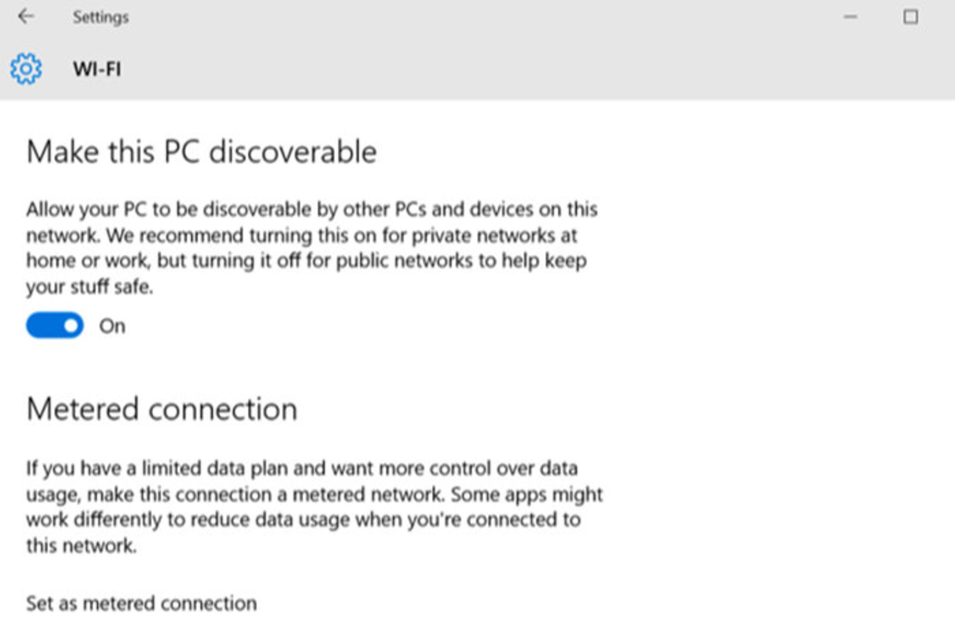 پس از انجام مراحل یاد شده، بسته به نوع شبکهی مورد استفاده چند گزینهی محدود در اختیار شما خواهد بود. با استفاده از گزینهی Make this PC discoverable میتوانید نوع شبکهی خود را کنترل کنید. به طوری که اگر دکمهی لغزنده را روی On قرار دهید، ویندوز شبکهی جاری را به عنوان یک شبکهی خصوصی فرض خواهد کرد و اگر دکمهی لغزنده را روی Off قرار دهید، ویندوز تنظیمات مربوط به شبکهی عمومی را به سیستم اعمال خواهد کرد.