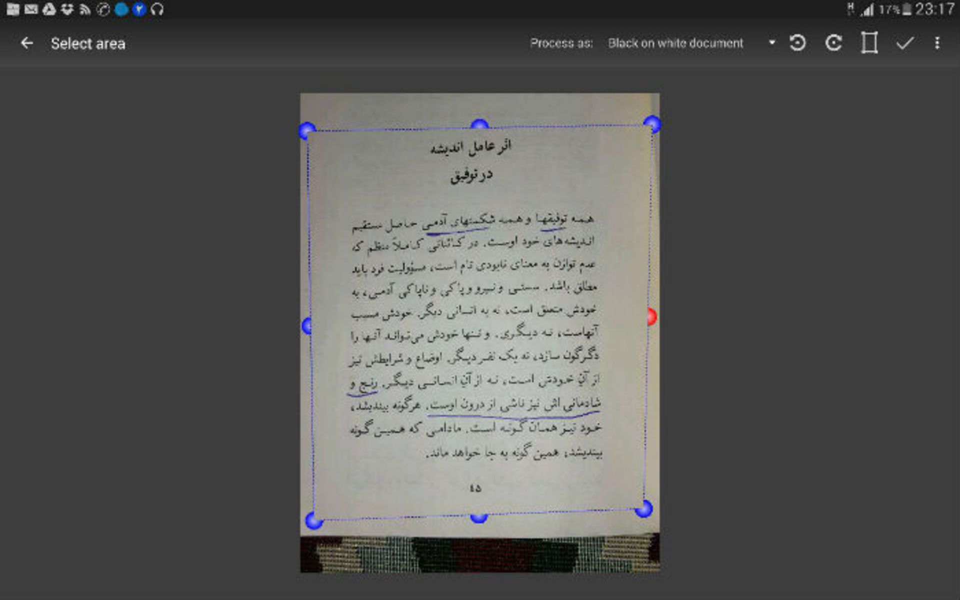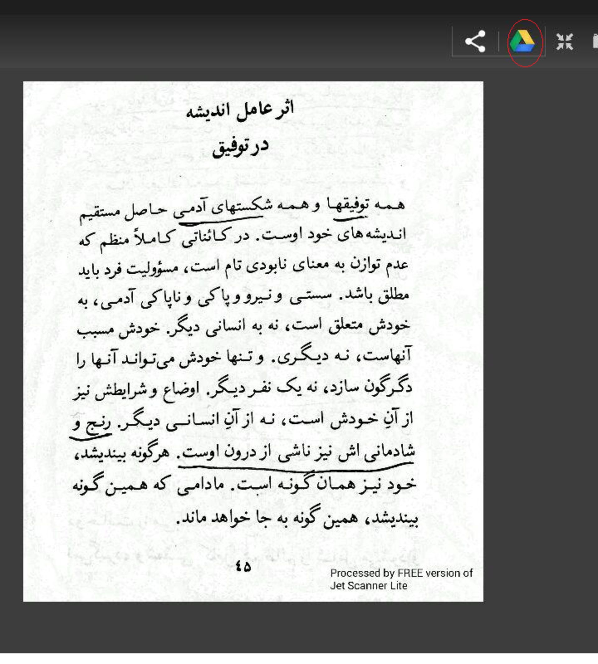 ۲. درصورتیکه فایل الکترونیکی مدنظر را ندارید راهحل اسکن صفحات مربوطه است. نرمافزار Jet Scanner Lite اسکن قابل قبولی را توسط دوربین گوشی شما ایجاد کرده که OCR گوگل درایو در این مورد بهخوبی عمل میکند. پس از دانلود این نرمافزار و عکس گرفتن از صفحهی کتاب مدنظر ، ناحیهای که اسکن میشود را مطابق شکل انتخاب و تیک √ را میزنید. حال میتوانید مستقیماً اسکن حاصله را به گوگل درایو خود که در منوی بالای اپ موجود است منتقل کنید. نمونه اسکن در شکل زیر نشان دادهشده است.