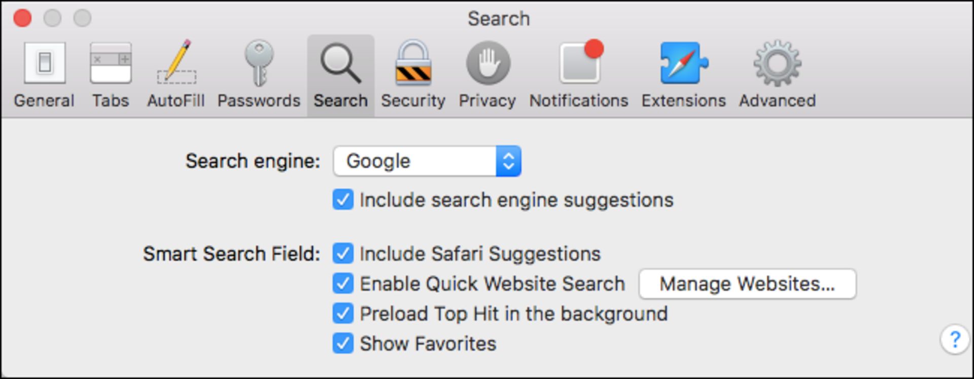 - فعال کردن جستجوی سریع (Enable Quick Website Search): وقتی در یک وبسایت جستجو میکنید، سافاری میتواند به خاطر بسپارد که آیا قبلا در این وبسایت جستجو کردهاید یا خیر. بعدا هنگامی که قصد دارید دوباره در این وبسایت جستجو کنید کافی است ابتدا اسم آن و سپس کلمات مورد نظر جستجو را تایپ کنید تا جستجو مستقیما در این وبسایت انجام بشود. اگر روی «Manage Websites» کلیک کنید، میتوانید لیستی از وبسایتهایی که سافاری به خاطر سپرده است مشاهده کنید.