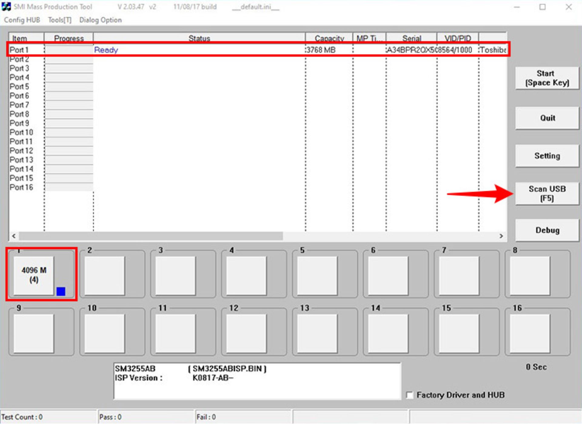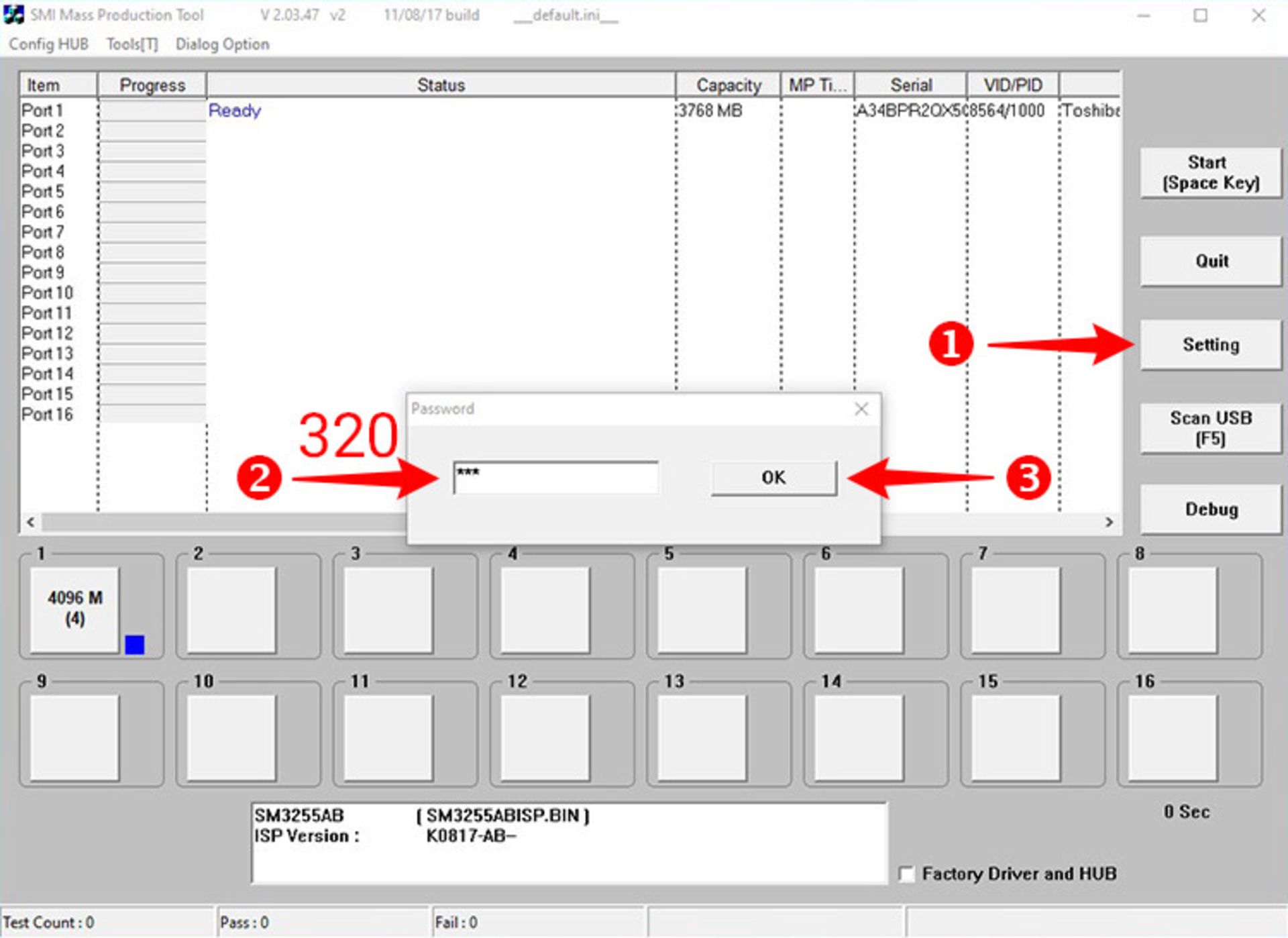 فایل دریافتی را از حالت فشرده خارج کرده و فایل sm32Xtest.exe را اجرا کنید. مراحل را مطابق آموزش سایت usbdev.ru انجام دهید و پارامترها را دقیقا مانند آموزش انتخاب کنید.
