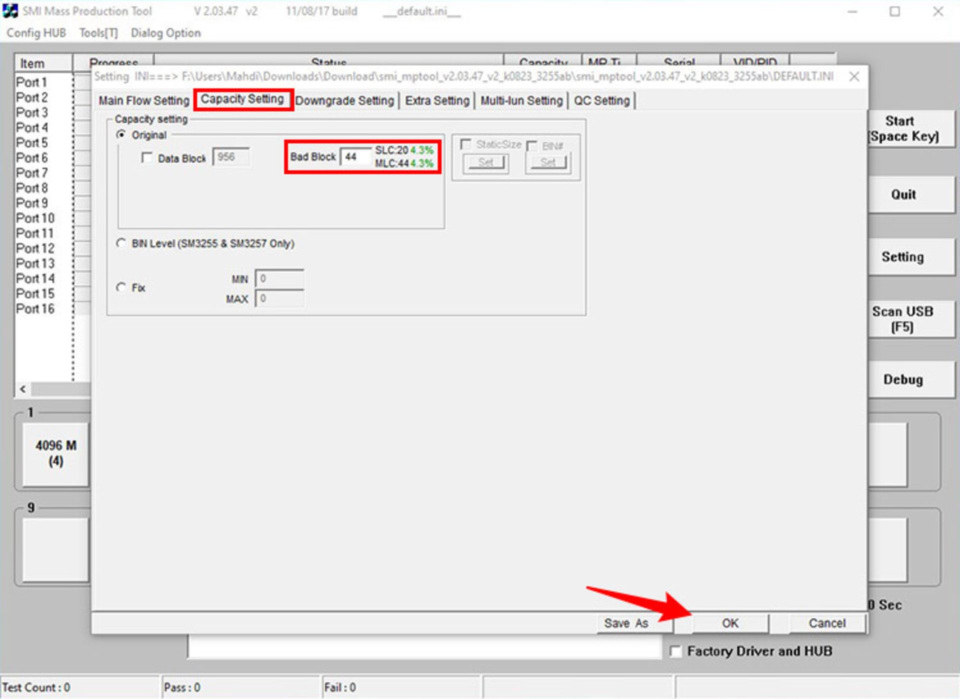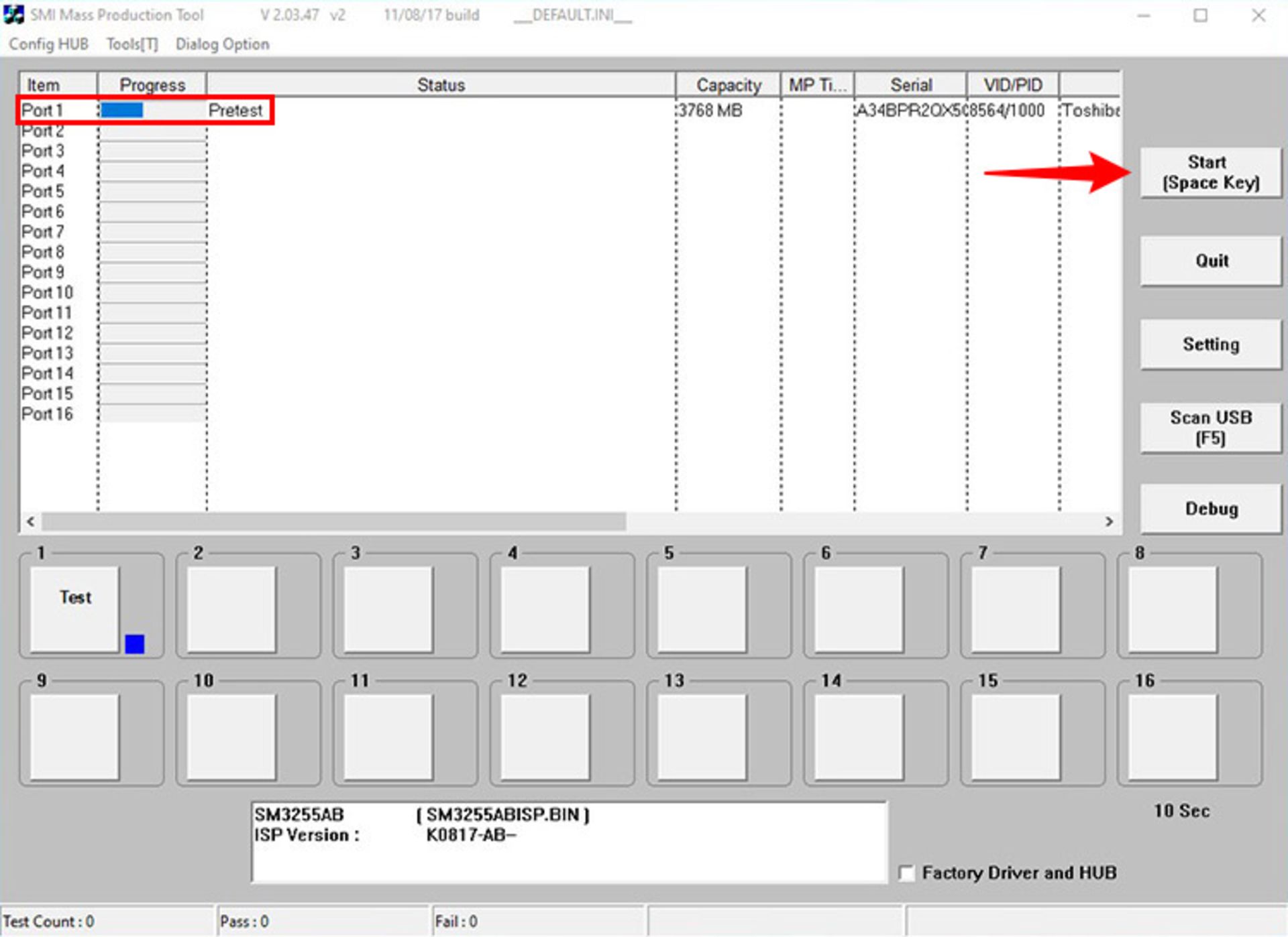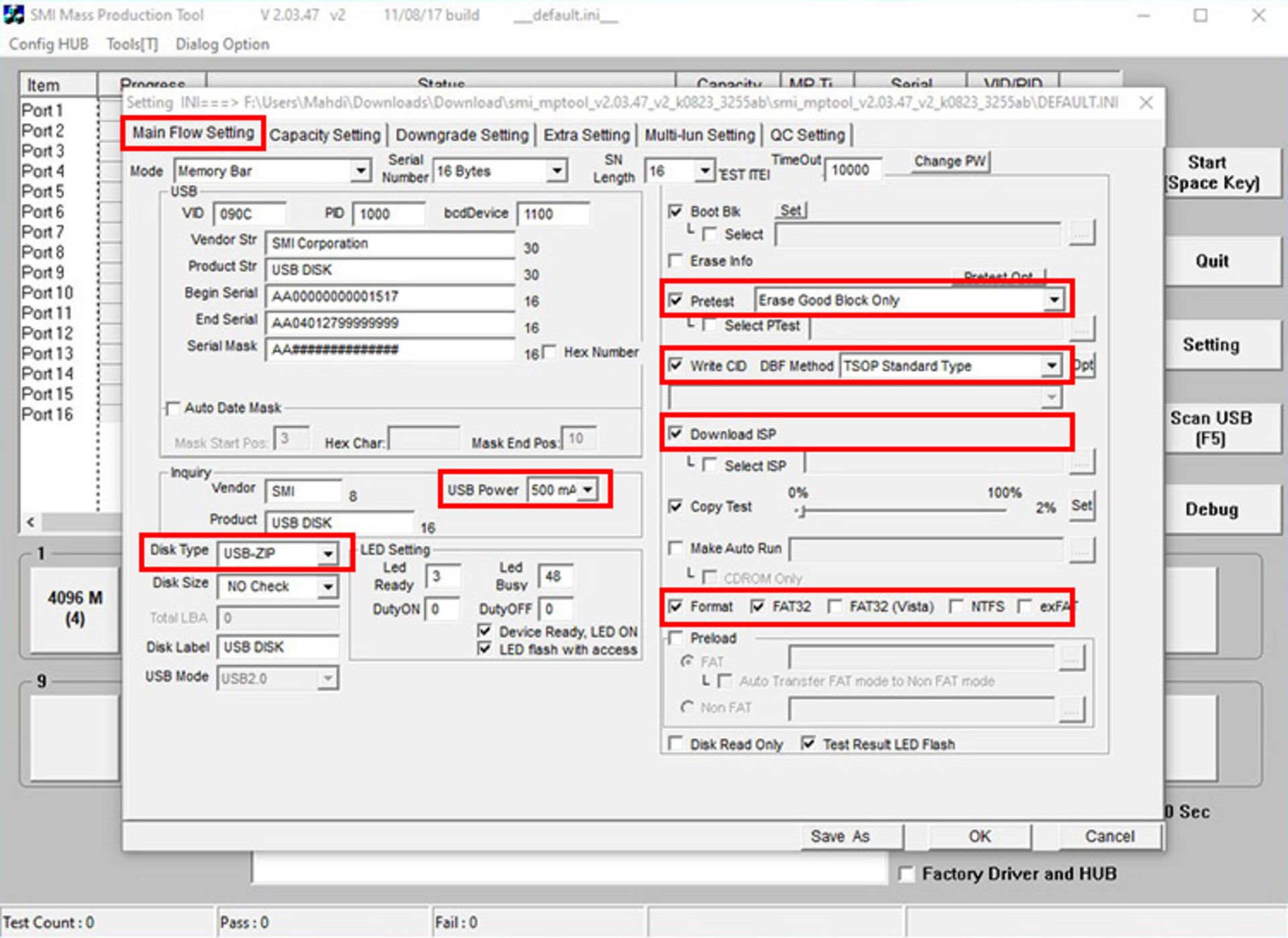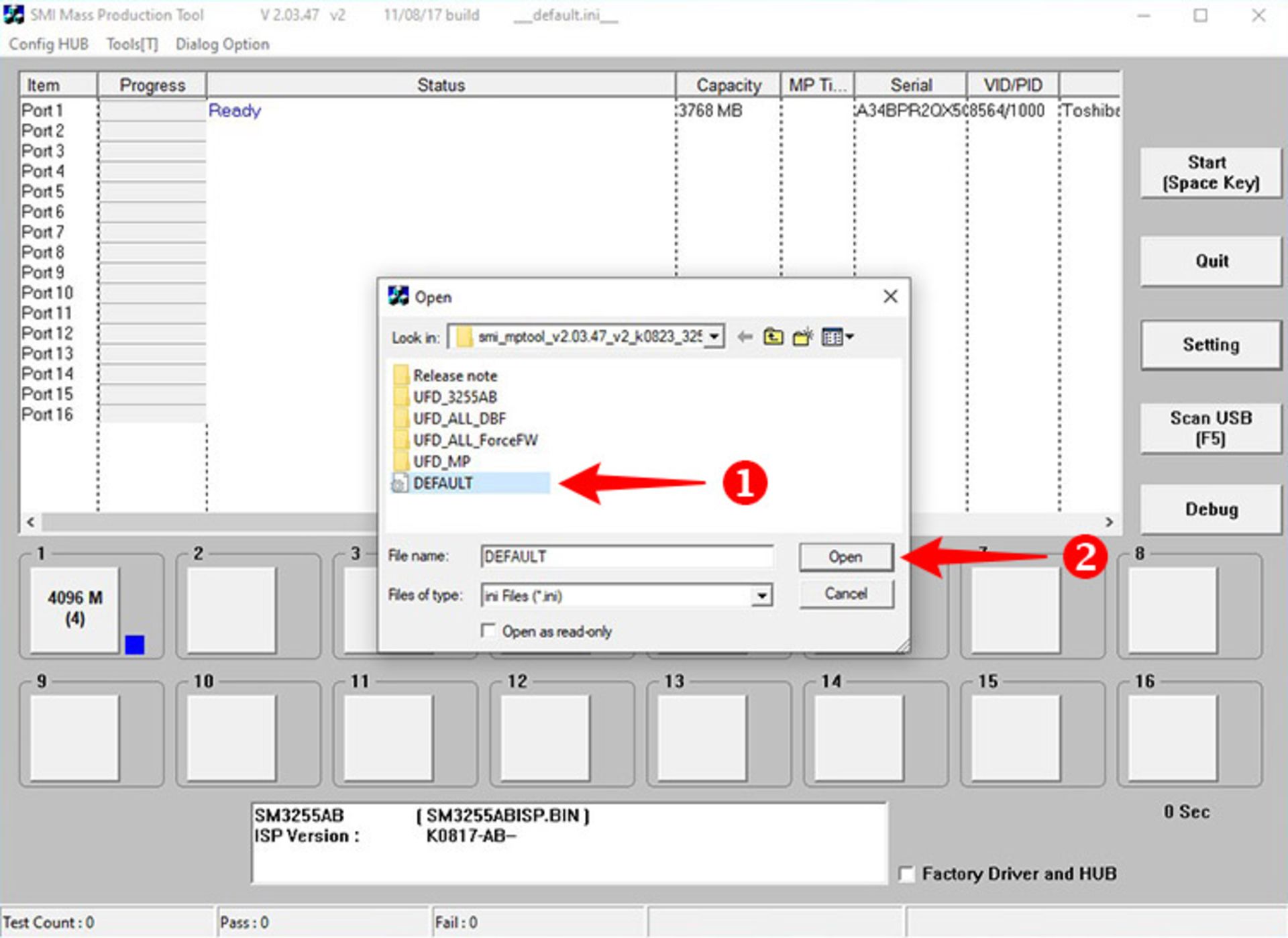 برای تکمیل آموزش، مراحل استفاده از ابزار SMI MPTool را مرور میکنیم که مناسب تراشهی SM3255 AB در فلش مموری مورد استفاده در این مقاله است.