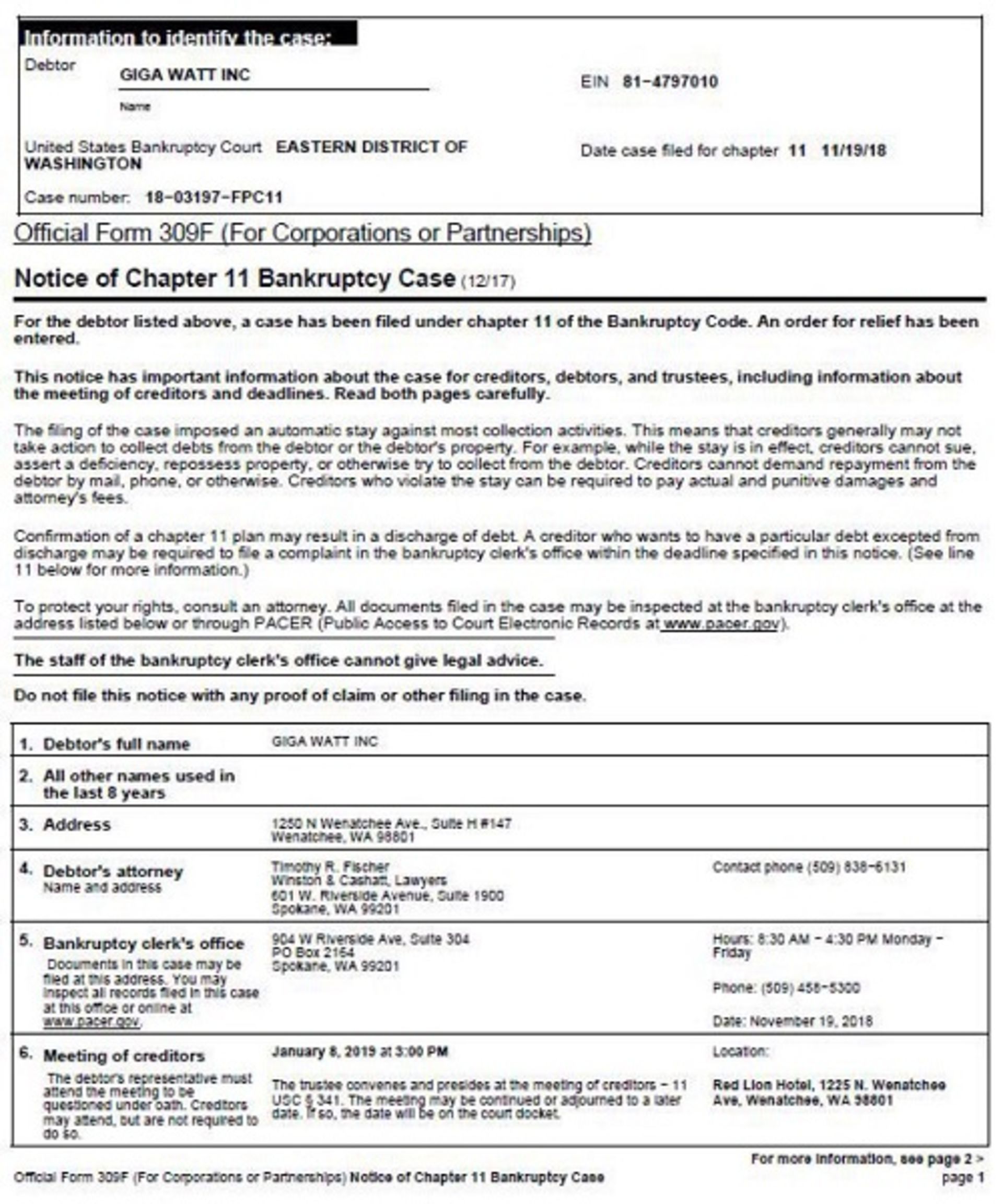 دو روز قبل از آنکه اخباری مبنی بر اعلام ورشکستگی گیگاوات منتشر شود، مشتریان بسیاری بهدلیل ازکارافتادن دستگاههای استخراج خود حیرتزده شده بودند. بااینحال، شرکت به مشتریان اعلام کرد هنوز در موزس لیک (Moses Lake) واشنگتن فعالیت میکند. دو روز بعد، اخباری مبنی بر بدهی ۵۰۰ هزار دلاری شرکت گیگاوات بههمراه اسناد ورشکستگی آن منتشر شد.