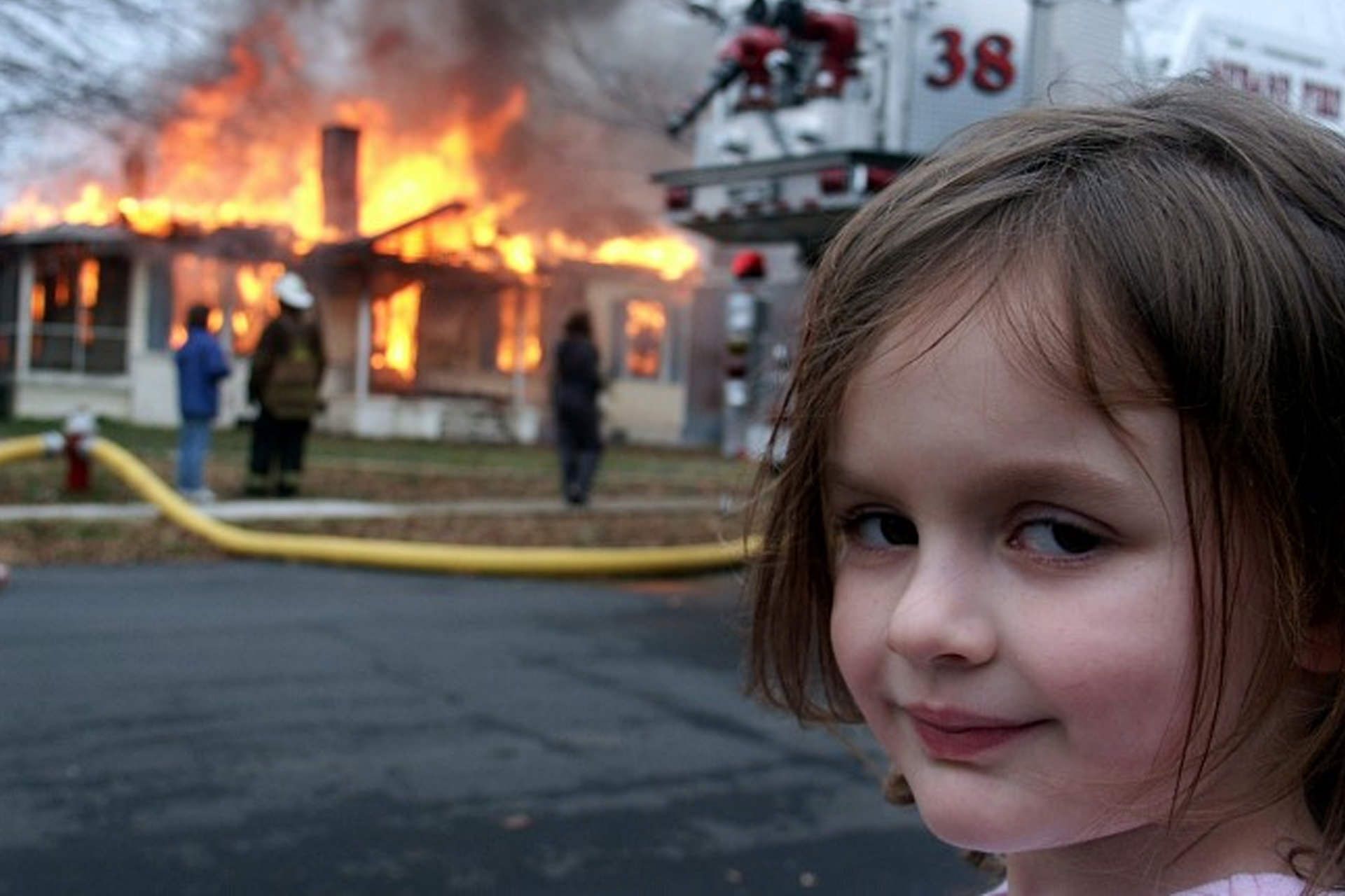 میم «دختر بلا» عکسی معروف است که به احتمال زیاد قبلاً آن را دیدهاید؛ این عکس توسط پدر زوئی روث از او گرفته شده است. روث در این تصویر به دوربین لبخند میزند؛ درحالیکه در پشت سر او خانهای در حال سوختن است.