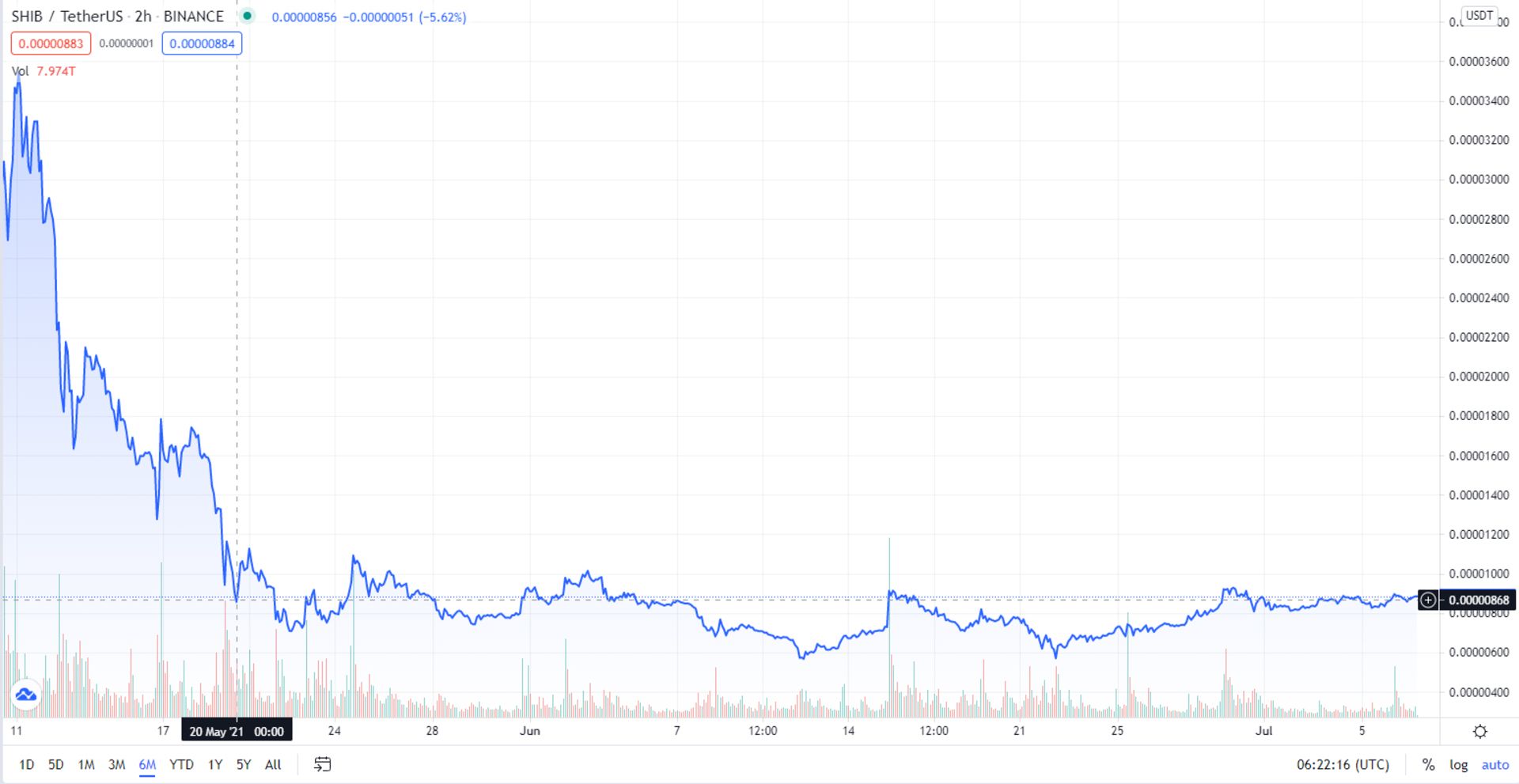شیبا اینو در می ۲۰۲۱ (اردیبهشت ماه ۱۴۰۰) رشد چشمگیری داشت و ارزش هر توکن آن در کمتر از ده روز از ۰٫۰۰۰۰۰۰۱۶۳۱ دلار به حدود ۰٫۰۰۰۳۶۴۰ دلار رسید. با اینکه کمی بعد با افت قیمت روبهرو شد، افزایش هزار و پانصد درصدی اولیهی ارزش آن سروصدای زیادی به پا کرد و باعث سر پا ماندن این رمزارز تا به امروز شد.