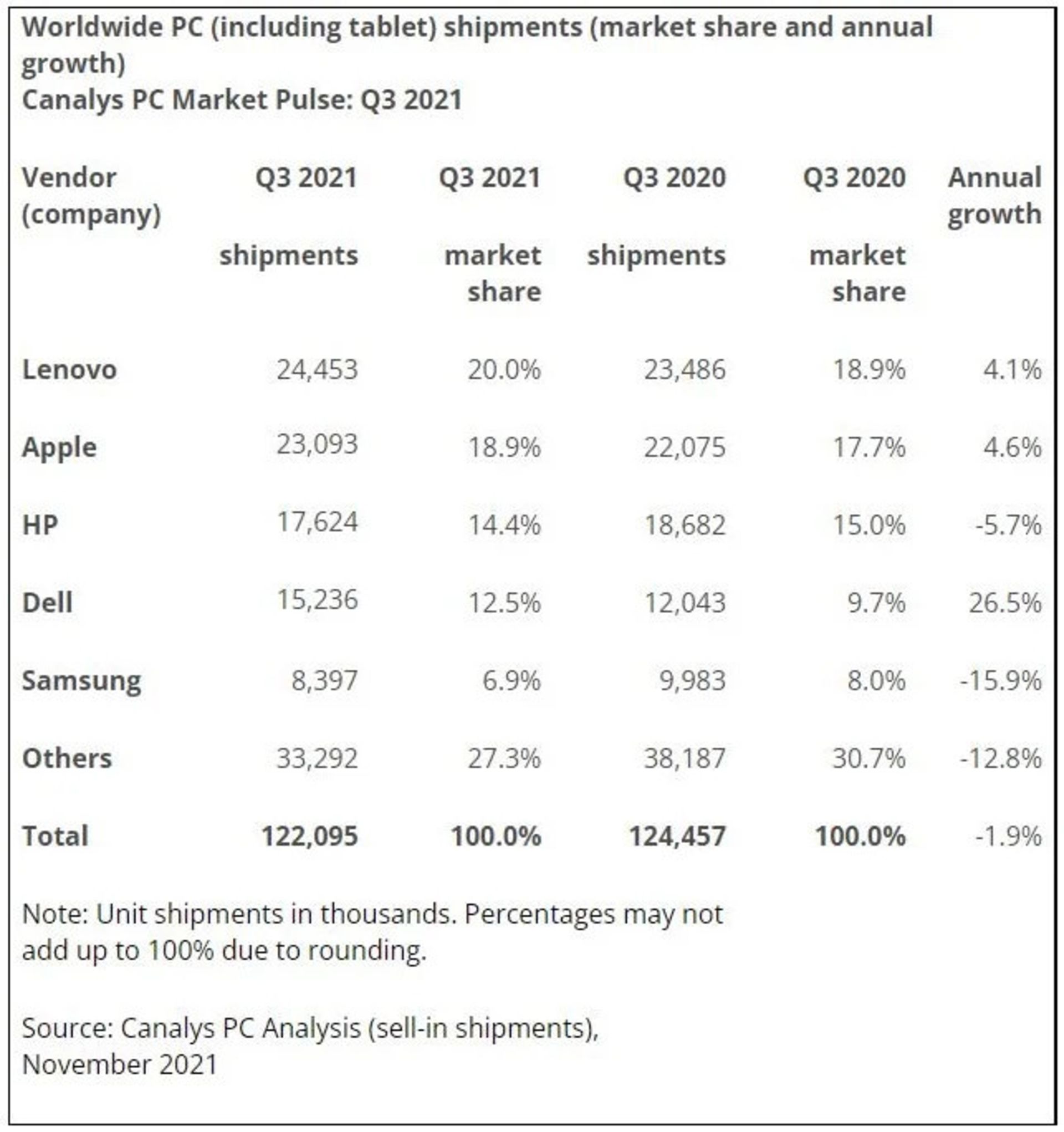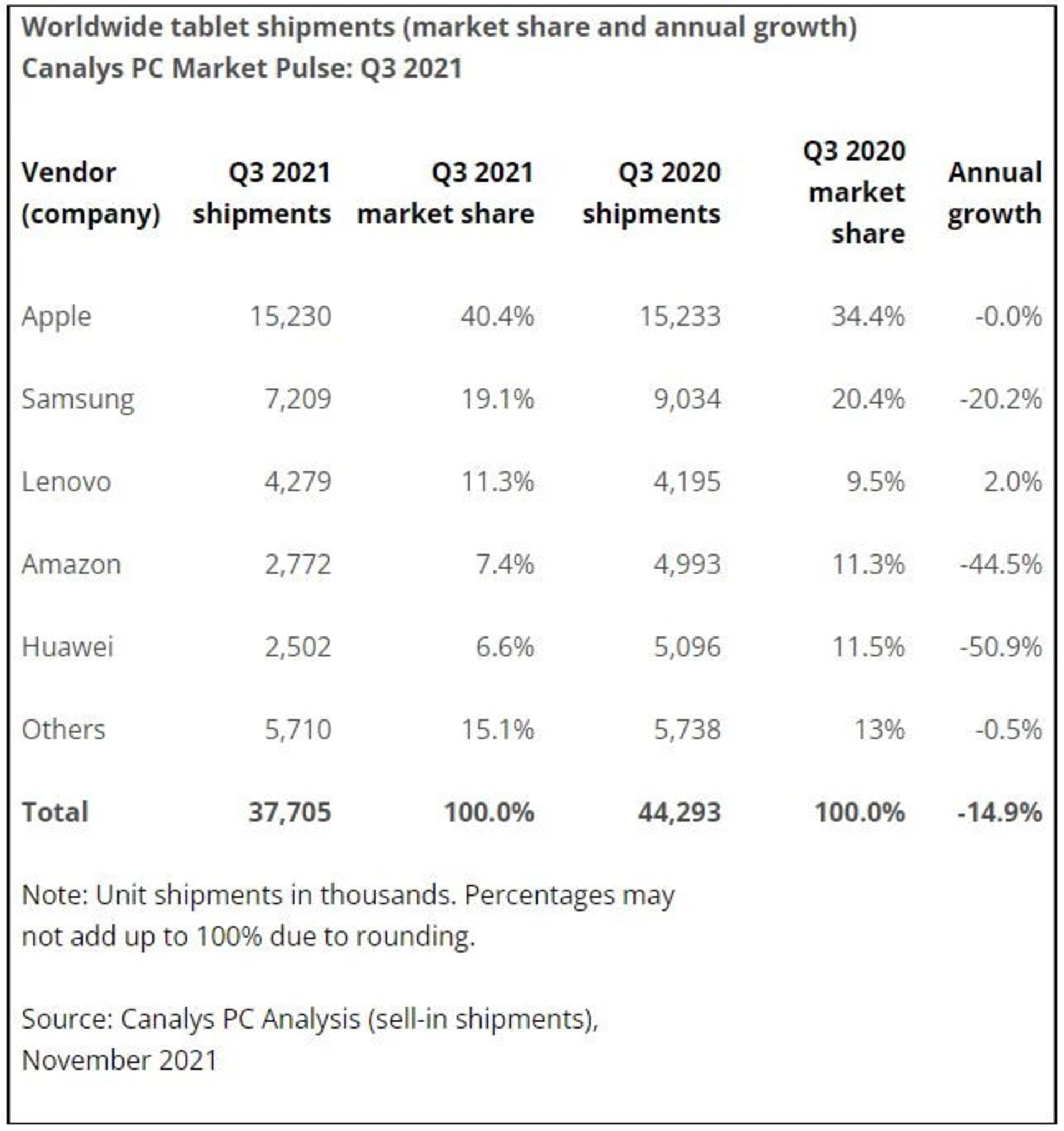 بهنقل از سمموبایل و بهگفتهی شرکت تحقیقاتی Canalys، عرضهی جهانی تبلتها در سهماههی سوم ۲۰۲۱ درمقایسهبا سال قبل کاهش شدید ۱۵ درصدی را تجربه کرده است و بهطورکلی، بازار رایانههای شخصی ازجمله تبلتها تقریبا در مناطق مختلف بهجز آسیااقیانوسیه با افت فروش مواجه شدند. سامسونگ درمقایسهبا سال گذشته کاهش چشمگیر ۲۰ درصدی را در بخش فروش تبلتها در سراسر جهان ثبت کرد؛ اما توانست جایگاه دوم را پس از اپل بهدست آورد.