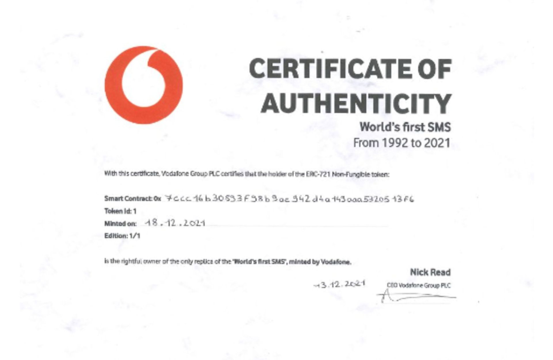 ودافون ۱۴ دسامبر ۲۰۲۱ (۲۳ آذر ۱۴۰۰) اولین پیام کوتاه تاریخ را به توکن غیرقابلتعویض (NFT) تبدیل کرد. این پیام کوتاه ۱۵ کاراکتر داشت و متنی برای تبریک کریسمس بود که ریچارد جارویس، کارمند ودافون، ۲۹ سال پیش، یعنی ۳ دسامبر ۱۹۹۲ (۱۲ آذر ۱۳۷۱)، از برنامهنویسی به نام نیل پاپورث دریافت کرده بود.