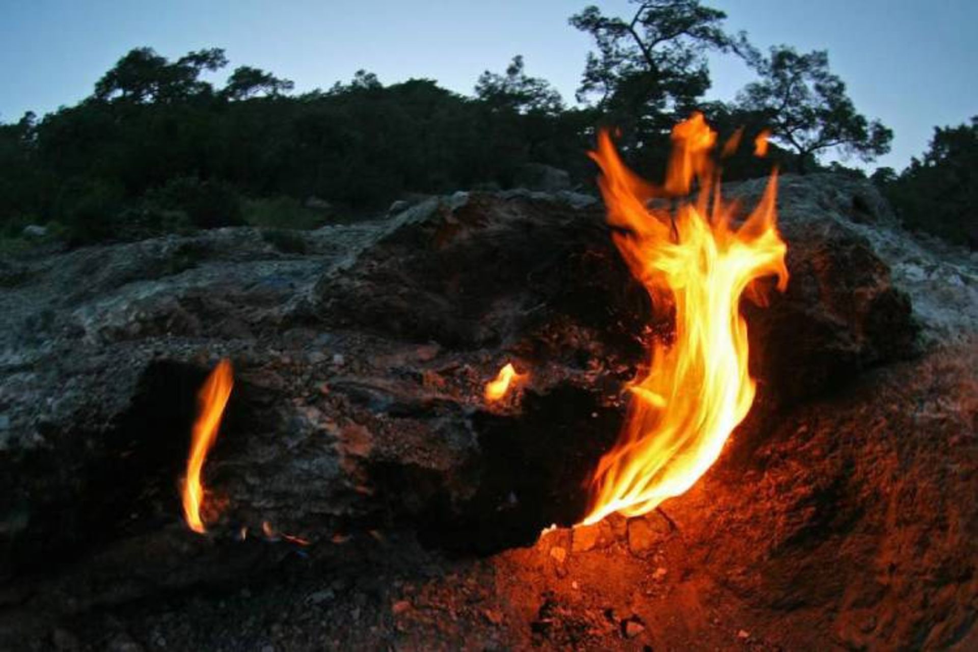 شعلههای ابدی که از میان سنگهای پارک ملی المپوس بیدگلاری ترکیه زبانه میکشد.