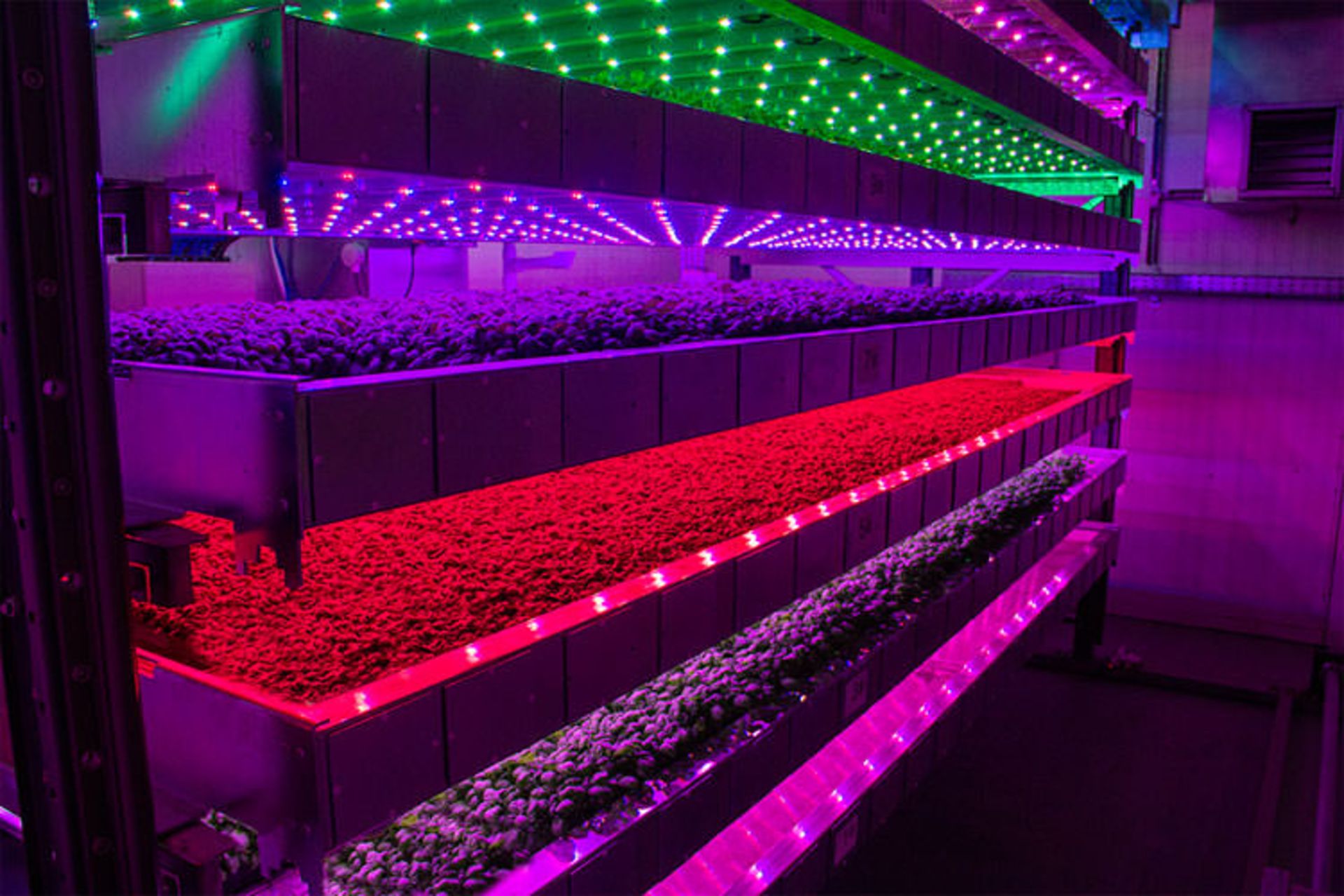 مزرعهی عمودی واقع در روستای اینورگوری، حتی یک گام دیگر نیز به جلو برداشته است. دیوید فارکوهر، مدیر اجرایی شرکت IGS میگوید این مزرعه از LEDهایی بهره میبرد که قابلیت تنظیم بسیار بالایی دارند. گرچه این لامپها، بیشتر مواقع طول موج آبی و قرمز تولید میکنند اما تجربهی پژوهشگران حاکی از آن است که رنگهای دیگر نیز نقش مهمی در مراحل مختلف رشد گیاه دارند. یک دوز از نور سبز در زمانی مناسب میتواند بازدهی تولید محصول را افزایش دهد. میزانی زمانبندیشده از تابش فروسرخ میتواند کیفیت شاخوبرگ محصول را بهبود دهد. از این رو، لامپها بهگونهای طراحی شدهاند که بتوانند ترکیبات مختلفی از نور قرمز و آبی را تولید کنند.