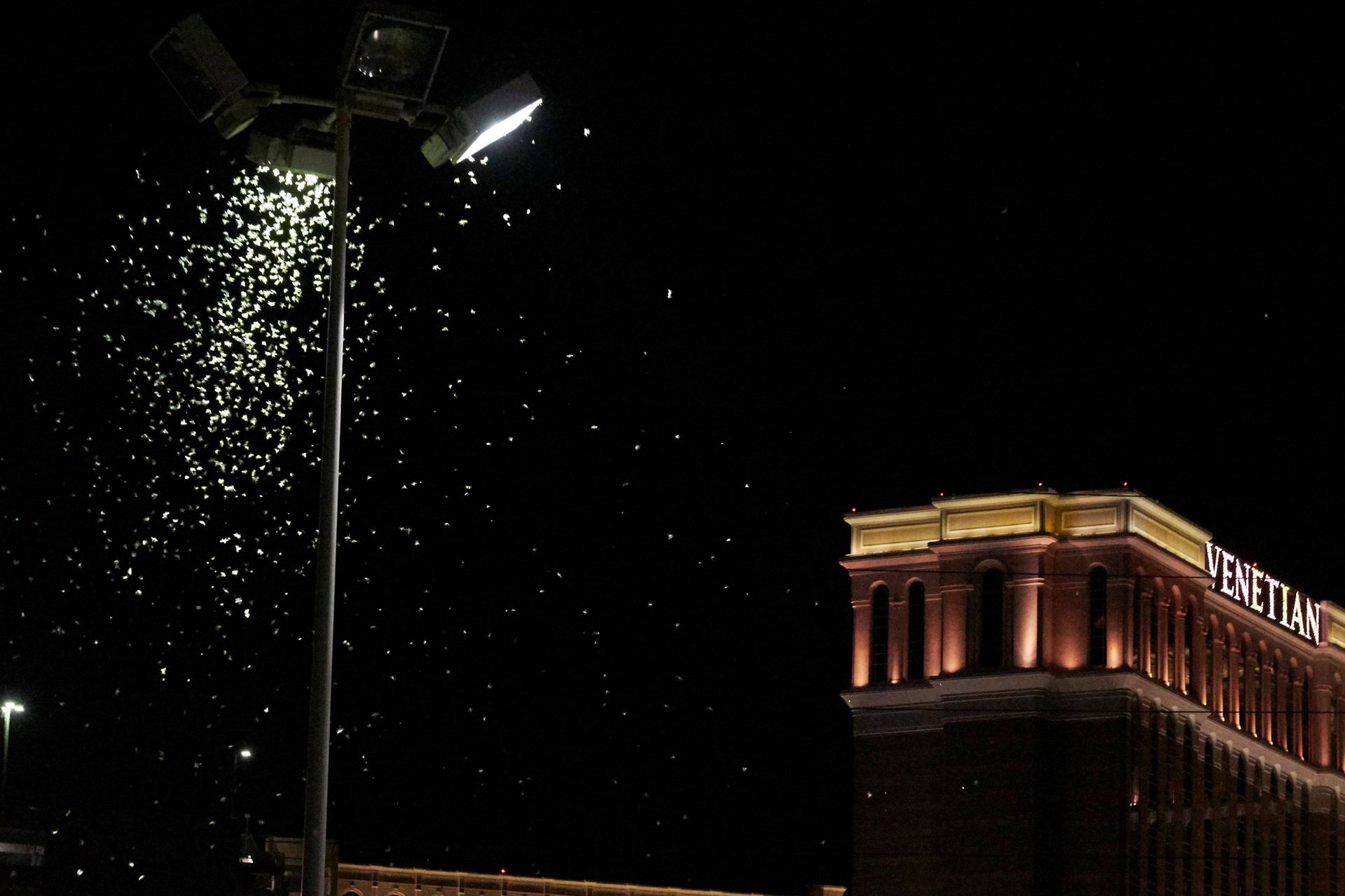پژوهشگران تخمین زدهاند که حداقل یک سوم از حشراتی که اطراف نورهای مصنوعی جمع میشوند، بر اثر تخلیه انرژی میمیرند یا توسط شکارچیها خورده میشوند. مطالعهی اخیری وسعت این تأثیر را نشان میدهد. بر اساس این مقاله که در مجله Biology Letters منتشر شد، در شب ۲۷ جولای ۲۰۱۹، درخشش چراغهای لاسوگاس شمار فراوانی از ملخهای مهاجر را از هوای بالا شهر بهسوی خود کشاند. ابرهایی از ملخ روی رادار هواشناسی قابل مشاهده بودند. السک تیلنس، بومشناسی از دانشگاه اوکلاهما و همکارانش با برآورد تعداد حشراتی که قبل، در جریان و پس از ازدحام دیده شدند، محاسبه کردند که در اوج خود، این گروه حشرات ۳۰٫۲ تن وزن داشتند و شامل ۴۸ میلیون ملخ میشدند. این وضعیت احتمالا در مقیاسهای کوچکتر در مکانهای زیادی و با حشرات بیشتری رخ میدهد.