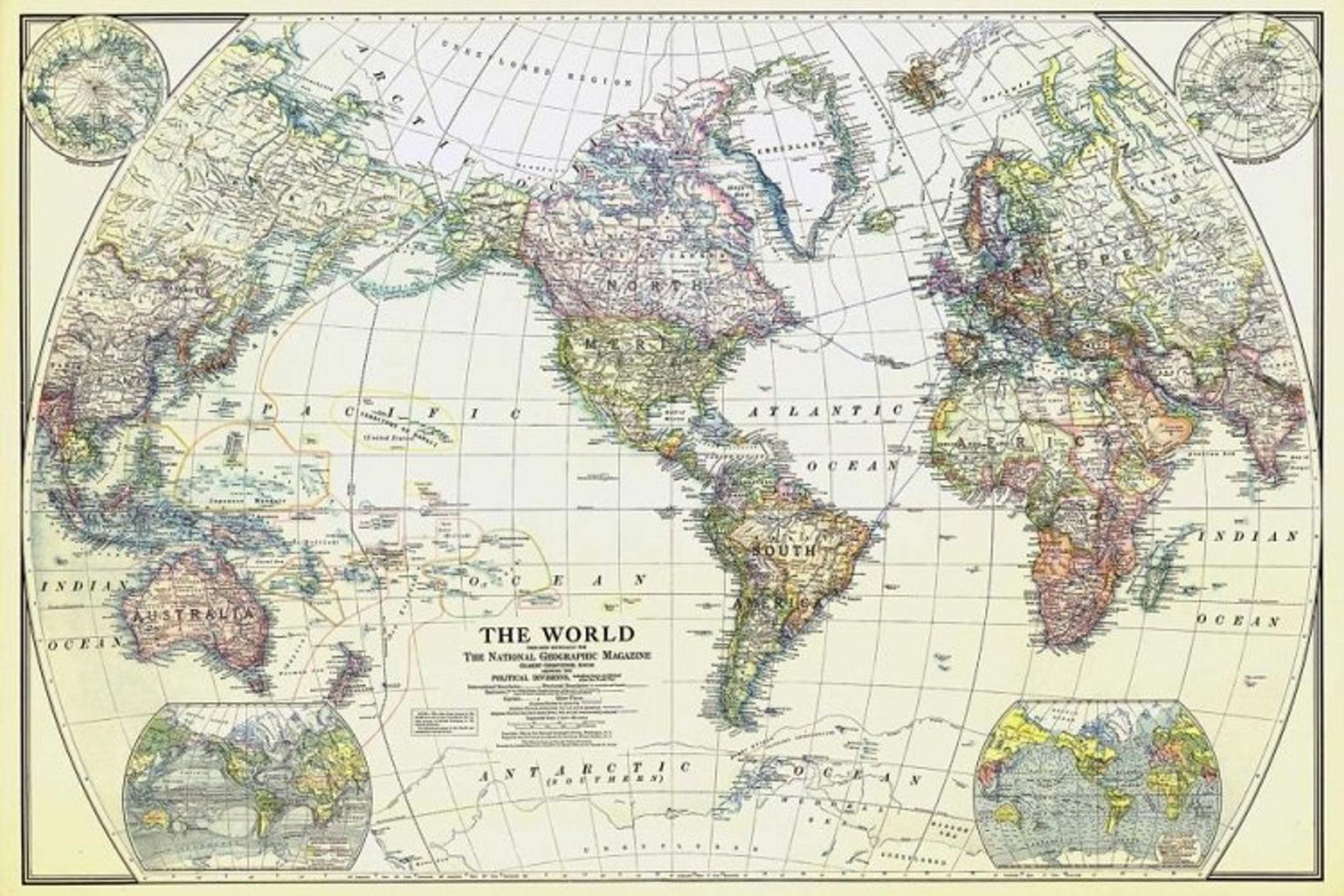 گیلبرت اچ گراونر، سردبیر وقت مجلهی نشنال جئوگرافی در دفتر کار خود دیده میشود (تاریخ عکس: ۱۹۱۴). وی در وصف نقشه میگوید: «نقشه بزرگترین شعر حماسی است. خطوط و رنگهای آن، تحقق رویاهای بزرگ را نشان میدهد.»