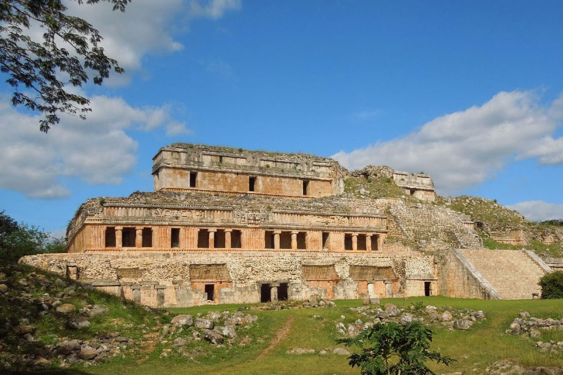 تصویر سهبعدی از kom، مخروبهای در شرق کیوک که مایاها در منطقهی پوک ساخته بودند. این ساختمان در اصل به شکل L بود و سه اتاق داشت که یک دهه بعد به آن اضافه شدند.