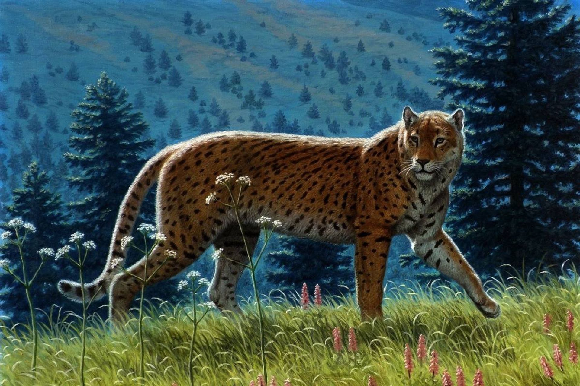 یک یوزپلنگ آمریکایی و تولههایش در غاری در گرند کنیون روی بقایای یک بز کوهی هرینگتون (Oreamnos harringtoni) خیمه زدهاند، درحالیکه یک تنبل زمینی (Nothrotheriops shastensis) به آهستگی از آنجا عبور میکند و یک رخکرکس کالیفرنیا (Gymnogyps californianus) در فاصله دورتر در آسمان پرواز میکند. درون غار، دو خفاش خونآشام (Desmodus stocki) از سقف آویزان هستند و یک موش جنگلی روی دیوار سمت راست پنهان شده است. ساختارهای تخممرغیشکل کف غار فضولات بهجایمانده از تنبلهای زمینی هستند (براساس یافتههای مکانهایی مانند غار رمپارت).