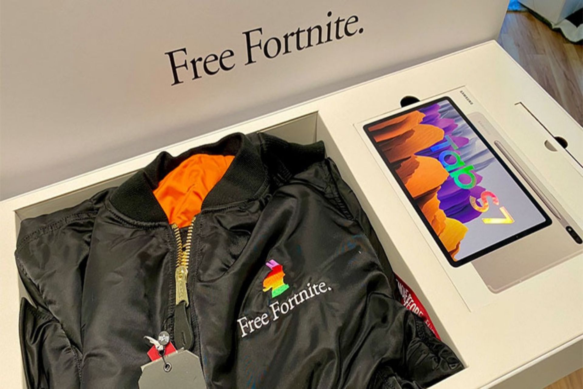هدیه‌ی اپیک گیمز به اینفلوئنسرها درحقیقت کاپشن ۱۶۰ دلاری Alpha Industries MA-1 است که در جلو و عقب آن لوگویی با آرم لاما به‌شکل رنگین‌کمان (برداشتی از آرم اصلی و قدیمی اپل) و متن Free Fortnite به‌معنای «آزادشدن بازی فورتنایت در اپ استور» به‌چشم می‌خورد. افزون‌براین، هدیه‌ی یادشده در جعبه‌ای سفید بسته‌بندی شده است که شباهت بسیاری به جعبه‌های محصولات اپل دارد. متن اپیک گیمز برای اینفوئلنسرها به‌شرح زیر است: