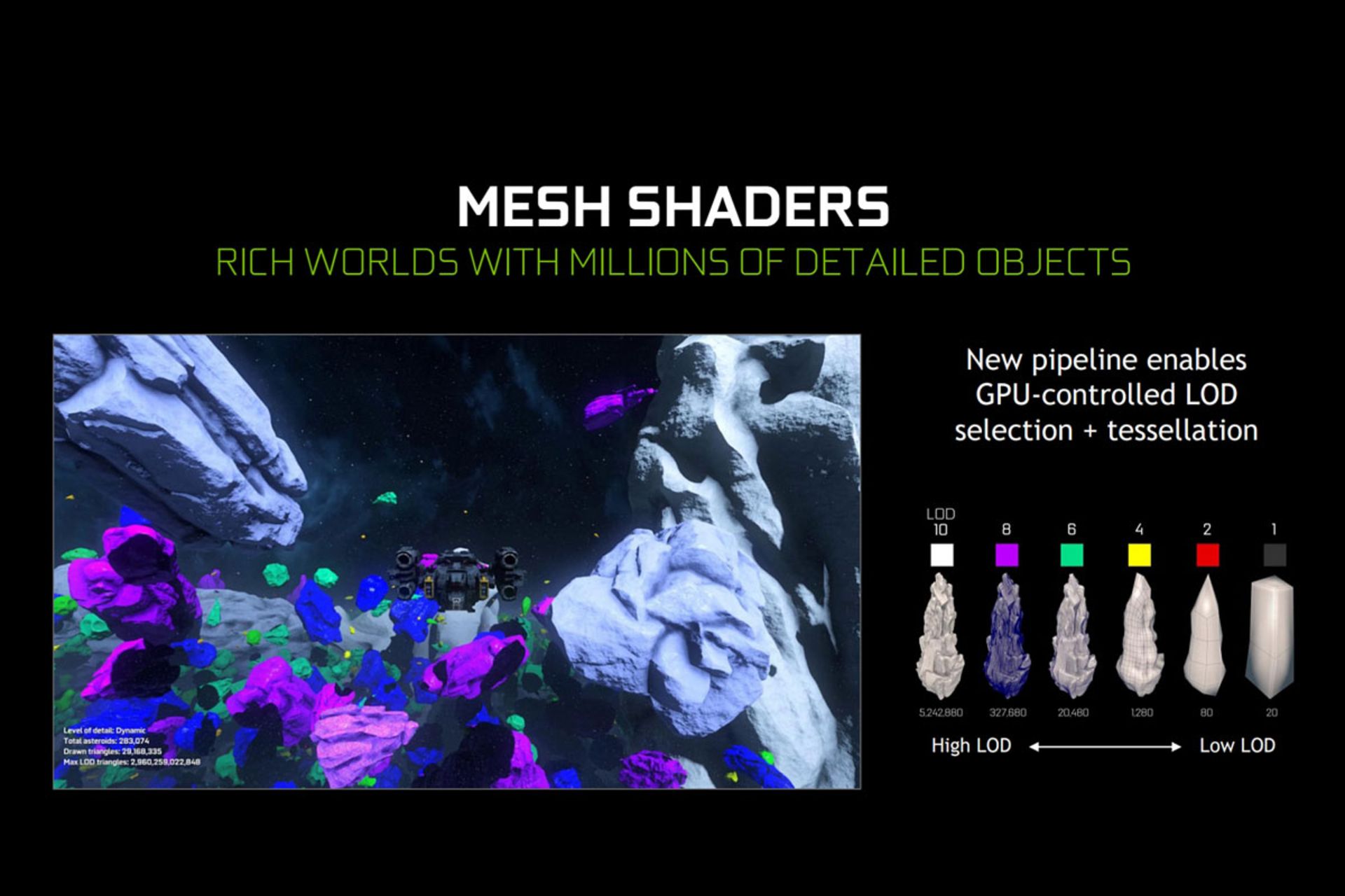 همان‌طور که از نام Mesh Shaders بر می‌آید، با سایه‌زنی مشبک در صحنه‌های رندر روبه‌رو خواهیم بود. به‌بیان دیگر اگر صحنه‌ی مشبکی با جزئیات زیاد و پیچیده داشته باشیم، این قابلیت ابتدا آن را به شبکه‌های کوچک‌تر تقسیم‌بندی می‌کند. سپس با بهره‌برداری از مراحل رندر مبتنی بر سخت‌افزار، توسعه‌دهنده‌ها می‌توانند هندسه‌ی بیشتری را به‌صورت موازی رندر کنند و در عین حال داده‌های کمتری هم در پردازش دخیل می‌شوند. مایکروسافت و انویدیا، قبلا توضیحات جزئی‌تری از Mesh Shaders در وبلاگ‌های خود منتشر کرده‌اند.