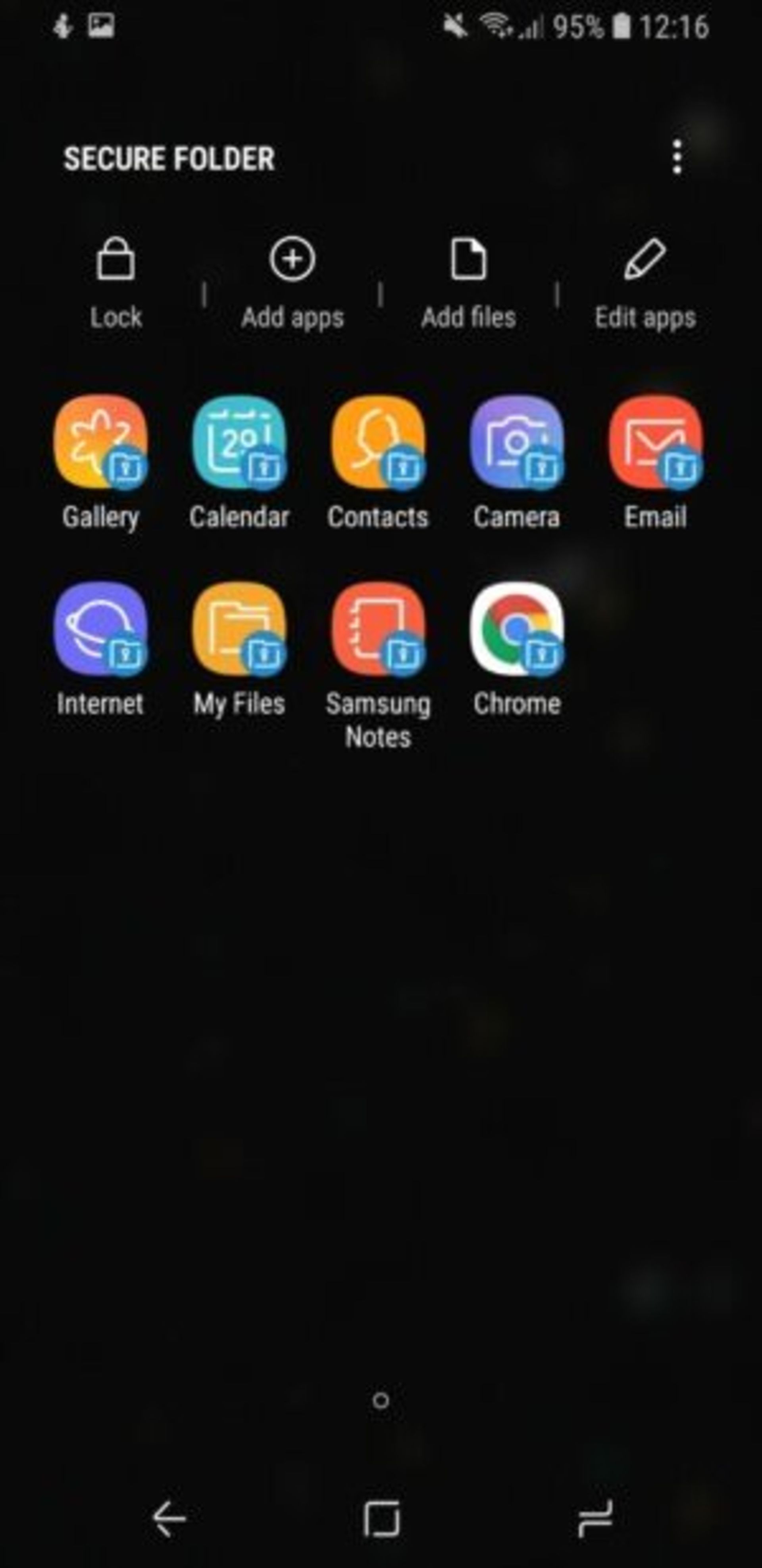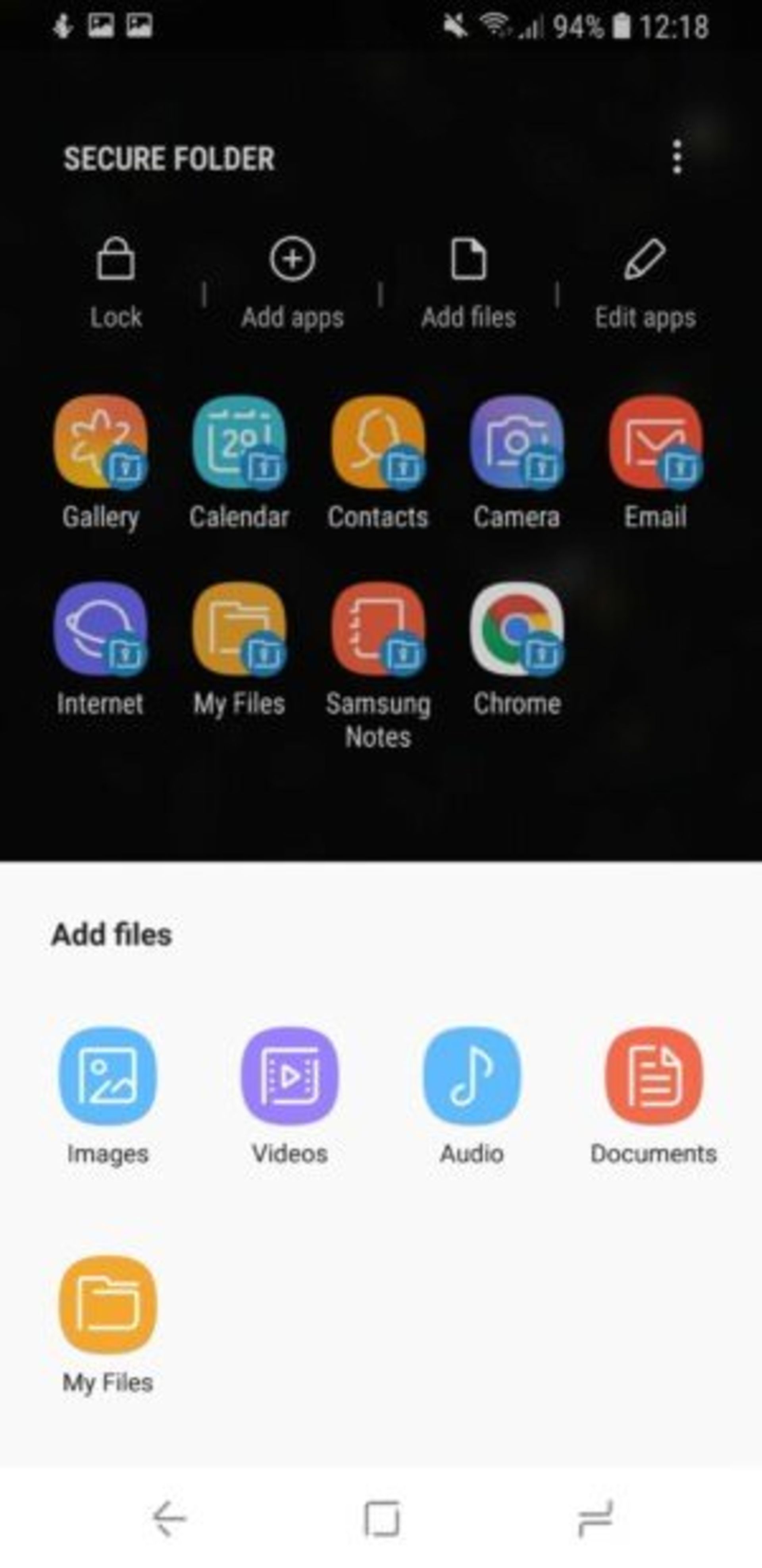 پس از انجام این تنظیمات پوشهی Secure Folder در منوی اپلیکیشنهای شما ظاهر میشود و میتوانید با انتخاب آیکونهای Add apps یا Add files در پوشه، اپلیکیشنها و فایلهای مورد نظر خود را اضافه کنید. درضمن میتوانید فایلهای اپلیکیشن My Files App را با لمس منوی سه نقطه و انتخاب گزینهی Move to Secure Folder به پوشه اضافه کنید.