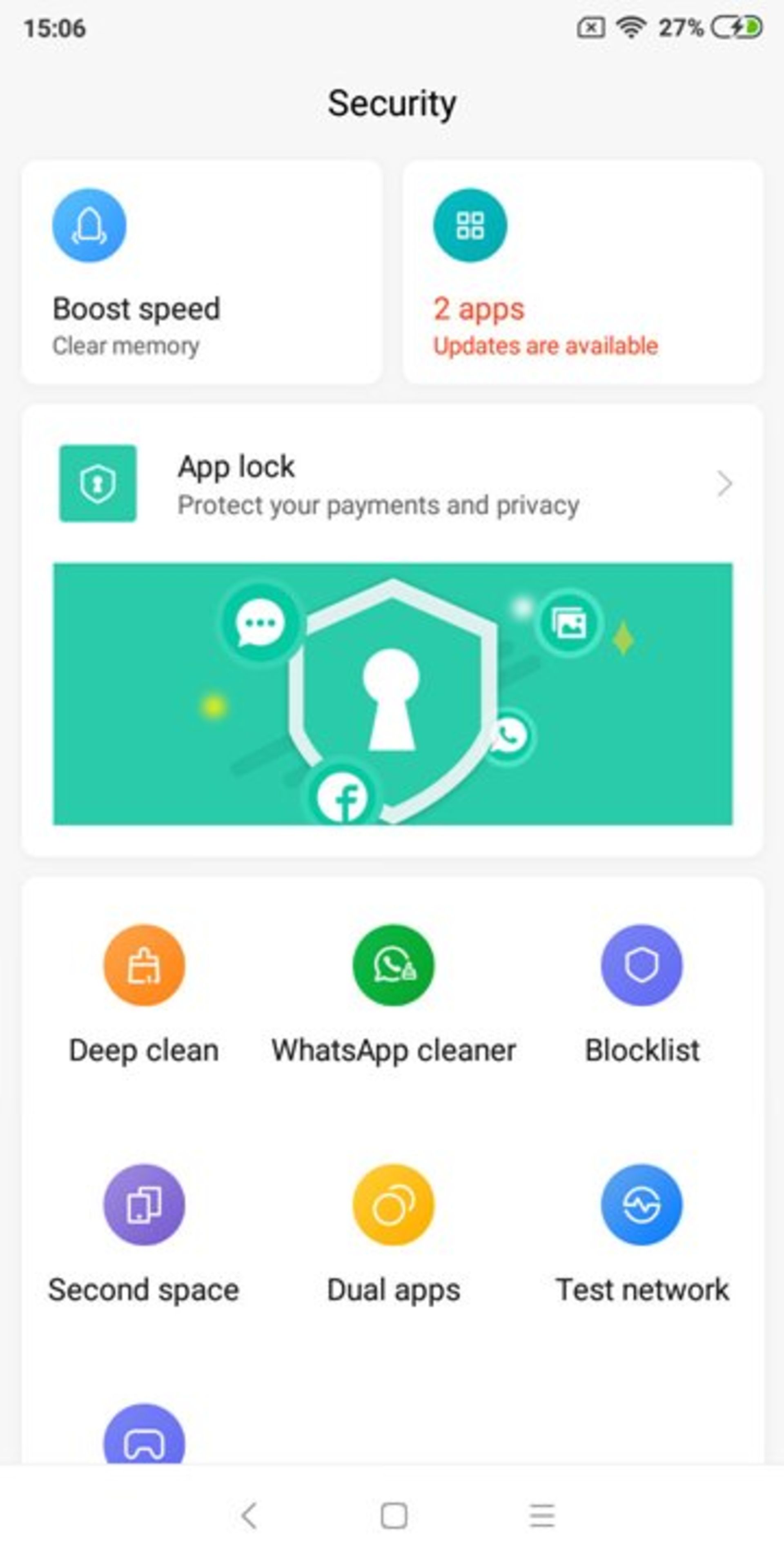 اپلیکیشن Security app ابزاری برای قفلکردن اپلیکیشنها در گوشیهای شیائومی است. برای فعالکردن این ویژگی پس از بازکردن این اپلیکیشن باید گزینهی App lock را لمس و اپلیکیشنهای مورد نظر را انتخاب کنید.