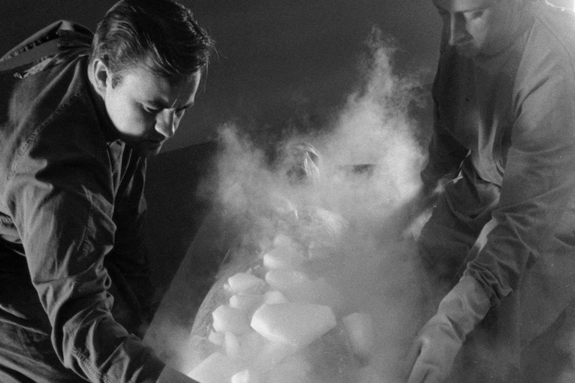 باب نلسون (سمت چپ) بههمراه دکتر دانته برونول، پزشک و زیستفیزیکدان، در حال منجمدکردن جسد در سال ۱۹۶۷
