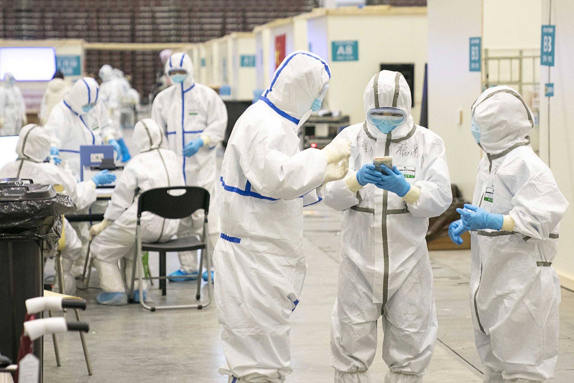 پزشکان بیمارستان ژونگنان دانشگاه ووهان درحال رسیدگی به بیمار مبتلا به کووید در ژانویه ۲۰۲۰