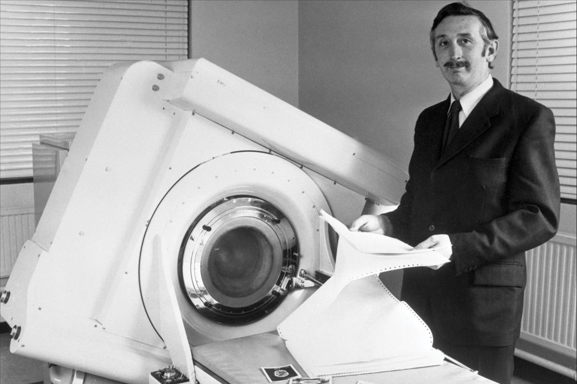 هانسفیلد برای آزمایش دستگاهش به بیماران واقعی نیاز داشت؛ ازاینرو، از یکی از عصبشناسان درخواست کمک کرد. گروه هانسفیلد دستگاه را در ۱ اکتبر ۱۹۷۱ در بیمارستان اتکینسون مورلی لندن نصب و اولین بیمار را با آن اسکن کردند: زنی میانسال با علائم تومور مغزی. اسکنهای اولیه سریع نبودند و سی دقیقه برای هر اسکن زمان لازم بود و پردازش دادهها روی کامپیوترهای مینفریم ۲/۵ ساعت طول میکشید.
