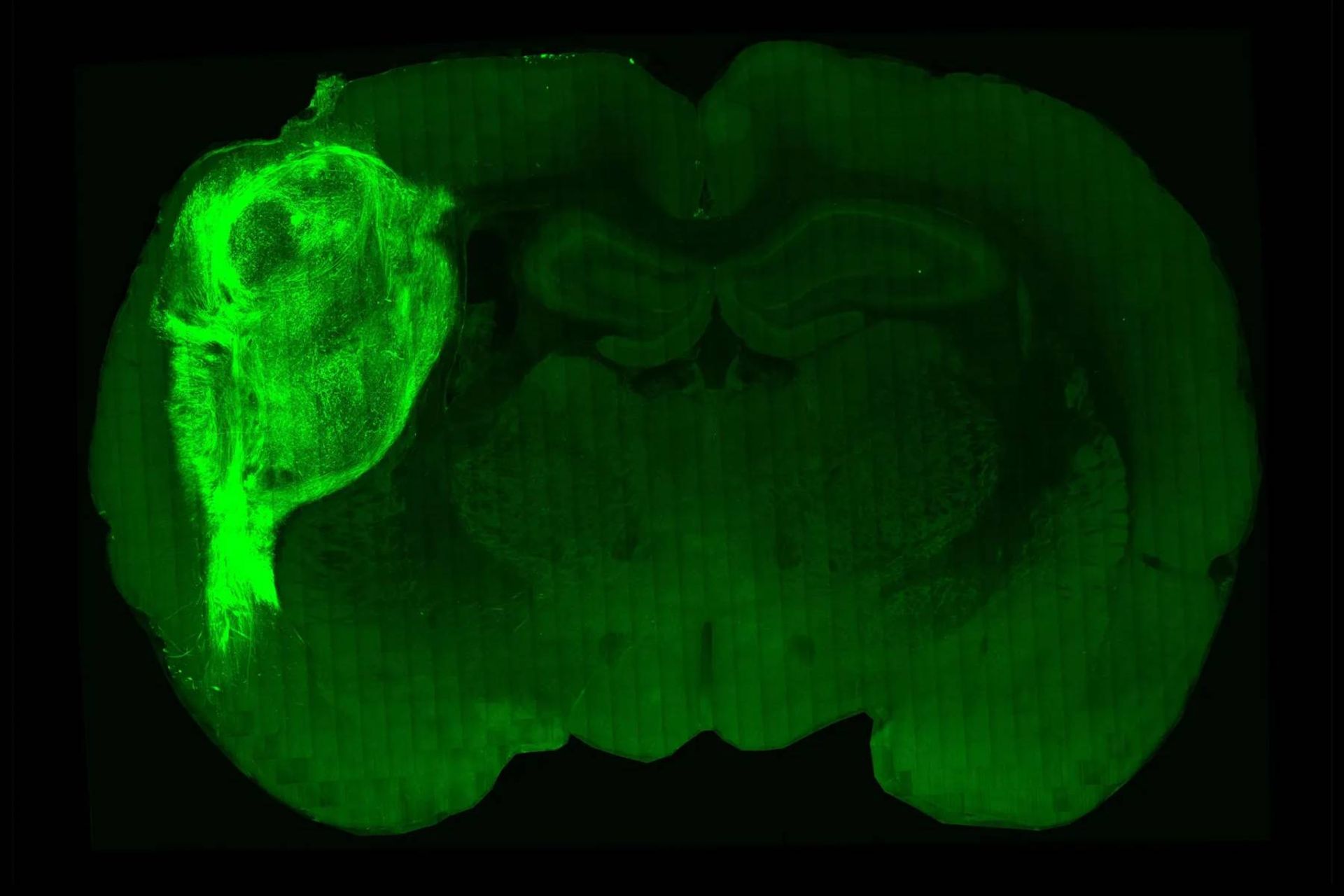شرح تصویر ابتدای مطلب: ارگانوئید انسانی پیوندشده که با پروتئین فلورسنت علامتگذاری شده است، در برشی از مغز موش صحرایی