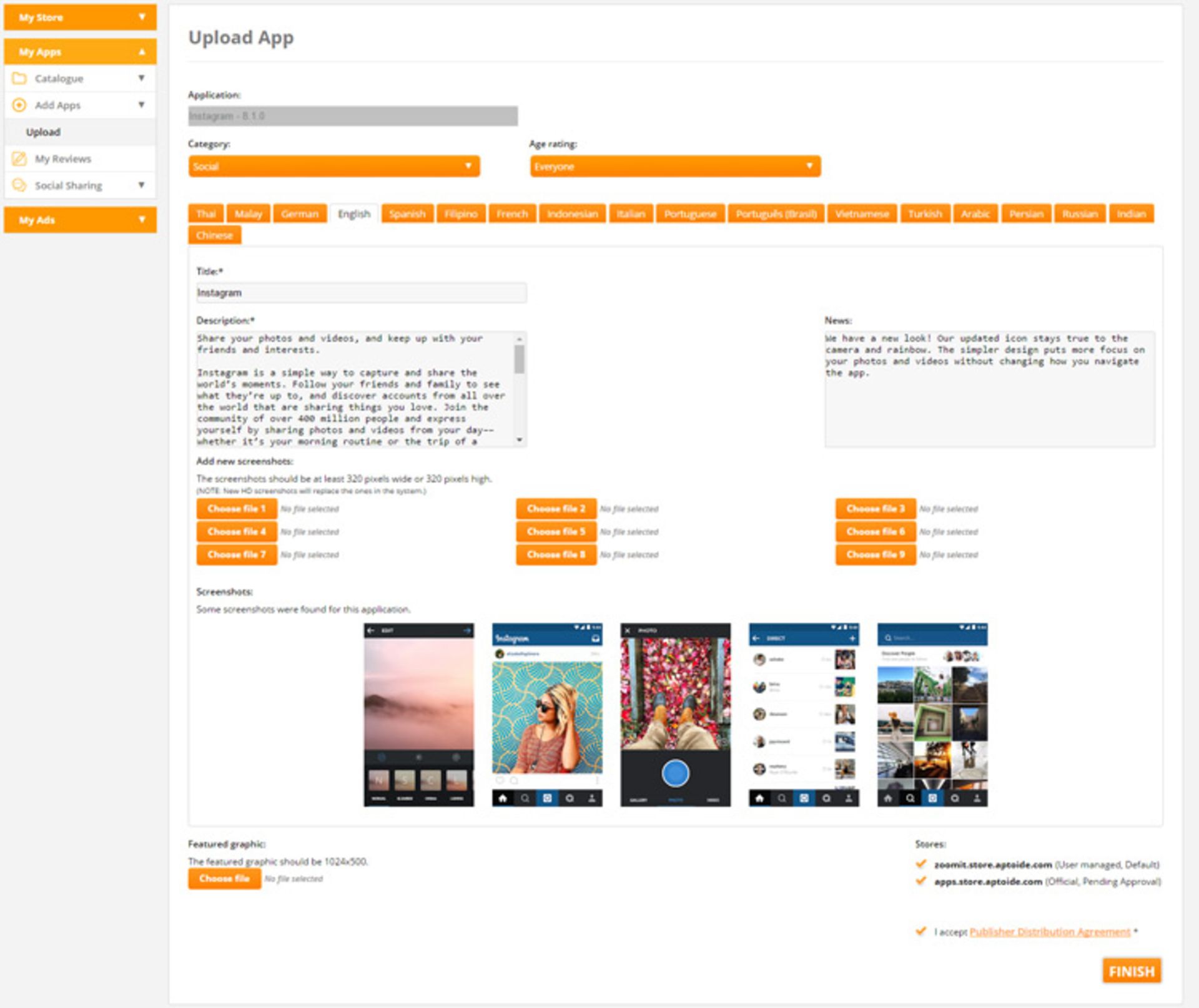 - آیکون و اسکرینشاتهای برنامه نیز قابل شخصیسازی هستند و میتوانید هر تصویری که دوست دارید را به عنوان اسکرینشات آپلود کنید. اگر اپلیکیشنی که اقدام به آپلود آن میکنید از قبل در Aptoide وجود داشته باشد اسکرینشاتهای آن به طور خودکار شناسایی و وارد پروفایل برنامه میشوند.