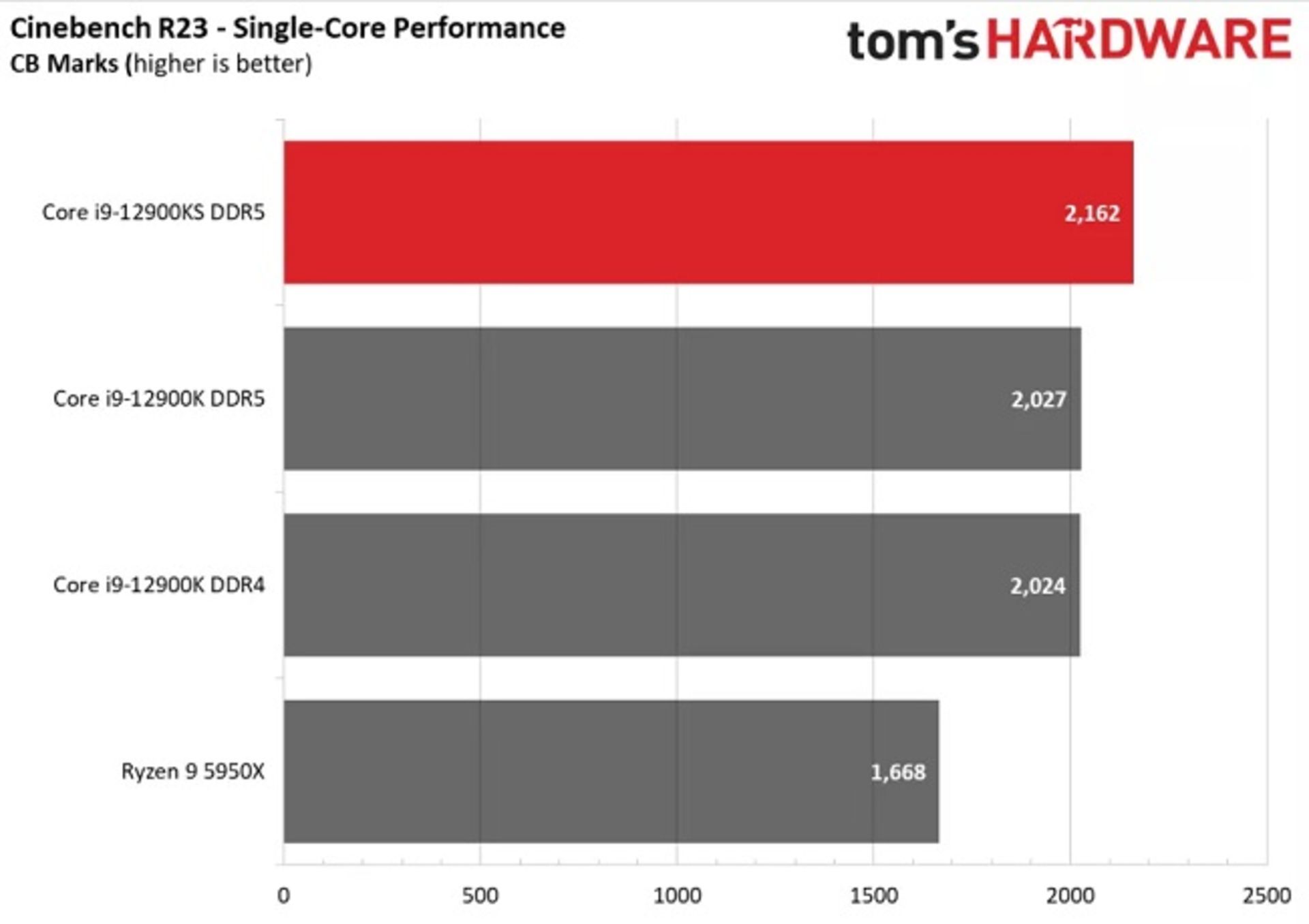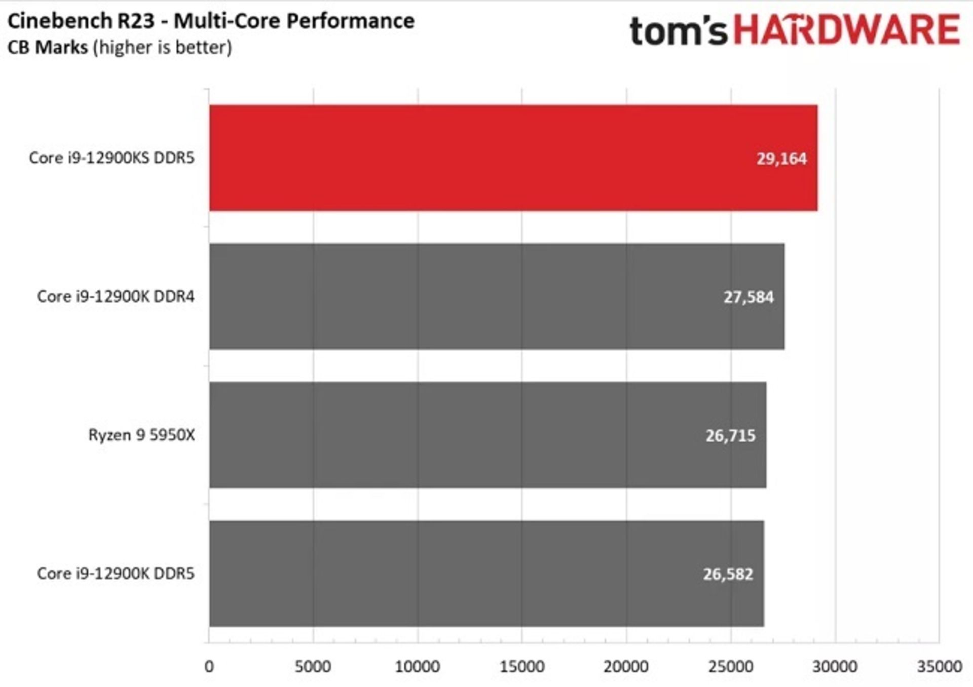 در آزمونهای معیار مقایسهی دادهای داخلی، رم DDR5-4400 با زمانبندیهای ۳۶، ۳۶، ۳۶ و ۷۶ و در برخی از آزمونها نیز پلتفرمی با حافظهی DDR4-3200 و زمانبندیها ۱۴، ۱۴، ۱۴ و ۳۶ بهکار رفته بود. بنچمارک Cinebench R23 در این دو پلتفرم نیز روی سیستمعامل ویندوز ۱۰ اجرا شده بود. مقایسهی پردازندهی Core i9-12900KS با نسل قبلی خود، یعنی Core i9-12900K، بهبود ۶٫۷ درصدی در عملکرد تکهستهای و ۵٫۷ درصدی در عملکرد چندهستهای را با رم DDR5 نشان میدهد.